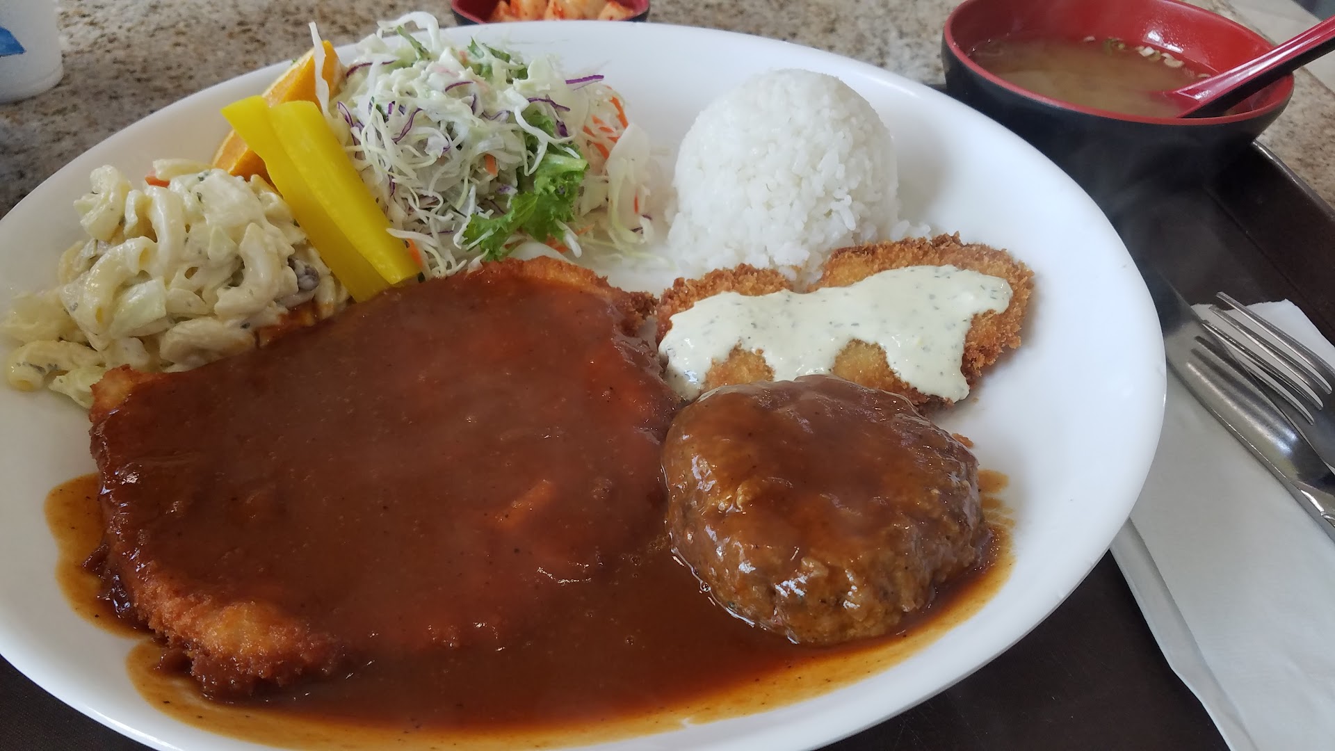 I love this place and drive out with my wife almost weekly .The food is delicious including fantastic Tonkatsu-(Japanese breaded pork loin)I usually order the Combination plate for $13.25 The combination includes a little fish (fried)with sauce,a little salsbury steak and Pork tonkatsu .it also includes Miso Soup ,Fresh Macaroni Salad .Kimchi and fresh ColeSlaw .A very satisfying meal .PS.The service is super fast .The Koreatown Galeria is beautiul and has a great grocery store on the basement floor ,as well as interesting shops ,in addition to the food court on...