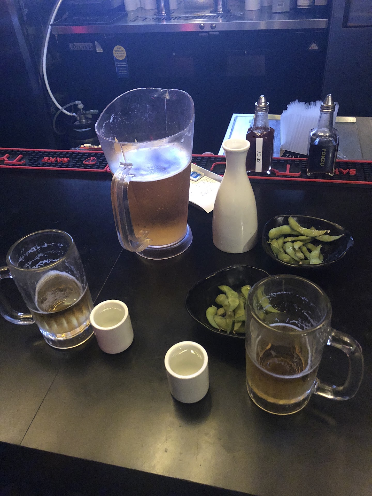 My boyfriend and I took a seat at the bar to enjoy a few pre-dinner drinks, we ordered a pitcher of Sapporo and large sake. I ended up getting a coupon for a free edamame that we snacked on while waiting. The bartenders were super nice and attentive, they kept checking to make sure we were doing well even though we were sitting at the end of the bar. I loved this! Often bartenders have ignored me when I'm on the end, it's like the forgotten spot.