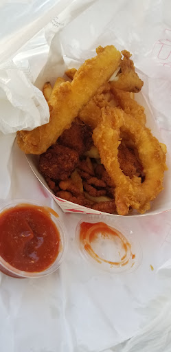 Read moreOrdered the seafood combo for $16. The fried fish is delicious and a large piece. The jumbo shrimp is also delicious; it's large for a shrimp, but considering it's the same price as a piece of fish, I would consider it just as a treat. The oyster was pretty good, the scallops were dripping juice (weird to me in a fried food), but the clams were tiny. You could taste the clams, but not really get any texture (they're the tiny fried crumbs in my pic). The fries were underwhelming and undercooked -- totally not worth it. I'll probably get a la carte instead of a combo next time. If you do get food from here, eat it right away. It's no good even on a 15 minute drive home because it will get soggy. I ate some on site (they have two tiny outdoor tables), and some at home, and it's a world of difference. Get the cocktail sauce, too! It's 40 cents extra, but it's so much better with the food than tartar...