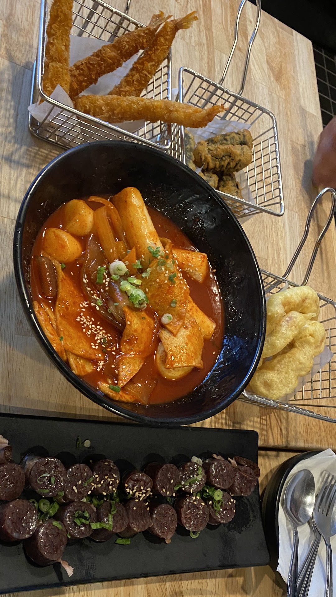 Baby chair broken. There is no belt. It is dangerous. I ordered ddukbboki, squid fried, gimmal-i fried, shrimp fried, soondae. When I ordered, I wanted to add topping mildduk, so I went topping bar and saw some pieces have fungus on it. I brought that to worker to show. Worker took it to kitchen. and after that, I haven’t see they clean it, so I asked “did you clean it?” They said they already did and said ‘thanks’ to me.. They served side menu first. Coming with silver mash basket. And I saw the basket has a stain. It was some ddukbboki sauce on it. Even it was not only one basket. So I told it to worker and she mentioned nothing and show me smile awkwardly(?) and disappeared 🤷♀️.. We got ddokbboki and soondae after #3 situation. Ddokbboki is not bad. But soondae was awful. My husband really like soondae and he really easy-going so barely complains. But he went to counter after one bite, and returned it… Smell was too bad to eat.. My husband started eating squid fried. There is very small amount of squid in it, it almost like bread…