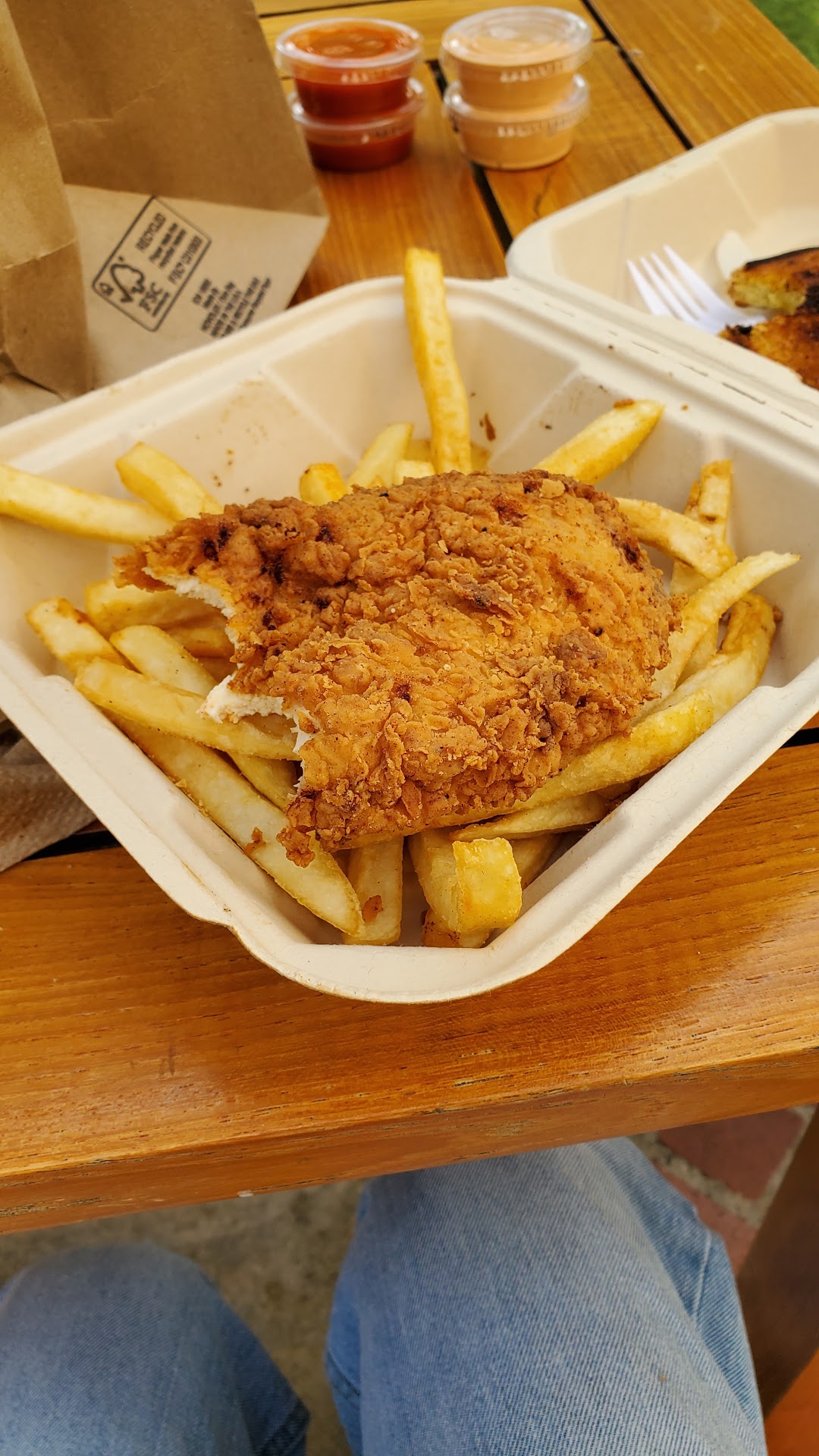 Read moreOverpriced Chicken Tenders & Burnt Toast...was eager to try this place out based on location, reviews and online menu & photos. Couldn't be more disappointed. Basically $12 for 2 chicken tenders, fries and Texas toast. Totally Raising Canes without the glitz. You walk up and order. It's not an inside eatery. I ordered the 2 PC tenders with fries and Texas Toast. Honestly, the portions are large. I ordered 2 of these combos for ne and my wife but we easily could have split one order. The tenders were ok. The breading was more crispy than I prefer and was pulling away from the chicken, creating almost a sandwich-like effect. Some of my fries weren't cooked all the way through and my Texas Toast was burnt on one side. Honestly, I'd rather go to Raising Canes. Food quality is much better and it's cheaper to boot. My advice....skip this place and go to Fat Sal's which is adjacent to...
