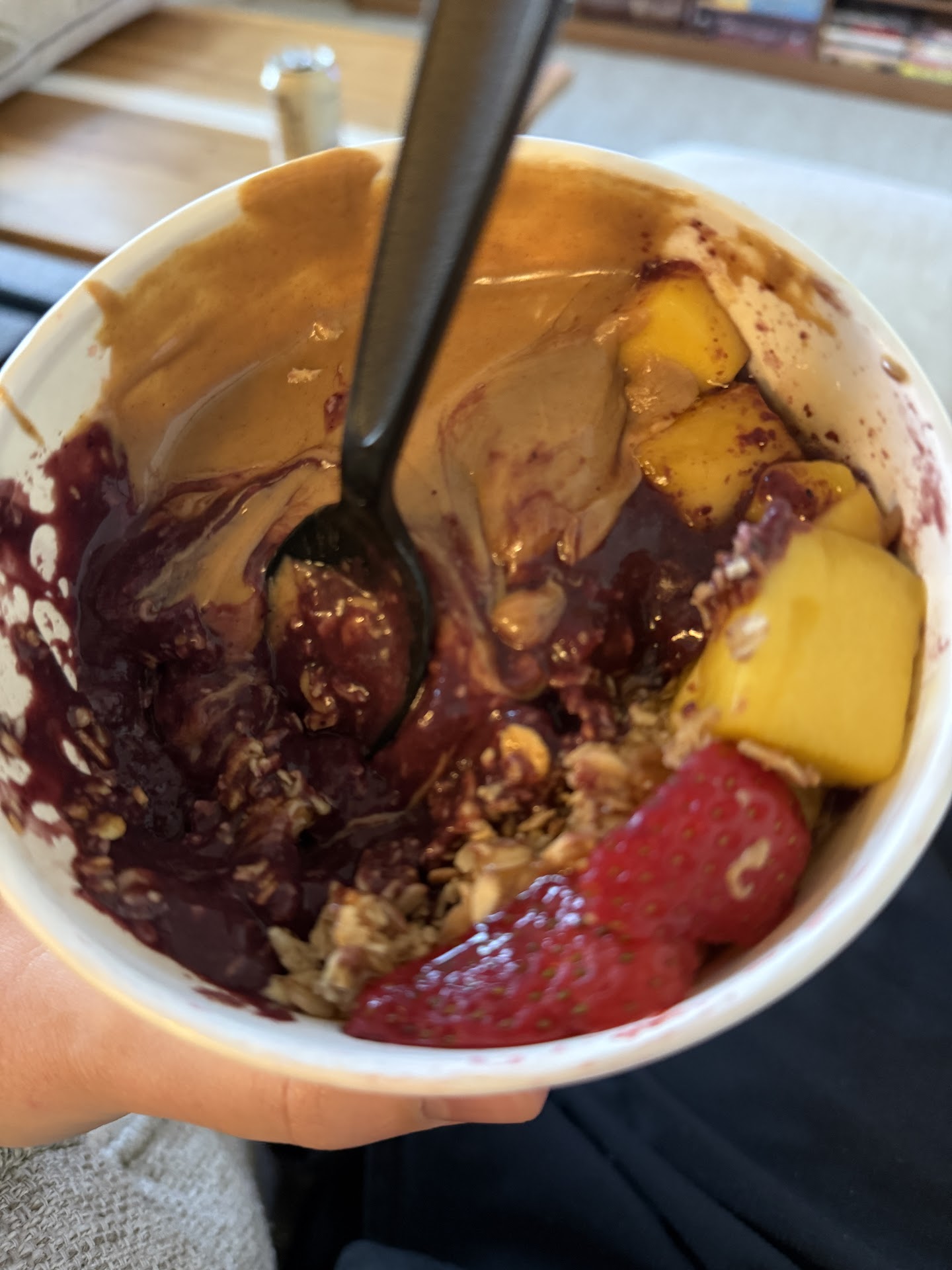 The flavor was just off for my taste buds and way too soft that it melted pretty quickly. I like acai frozen by itself with toppings on top instead of blended with apple juice. The fruit on top was a generous portion and fresh, though.
