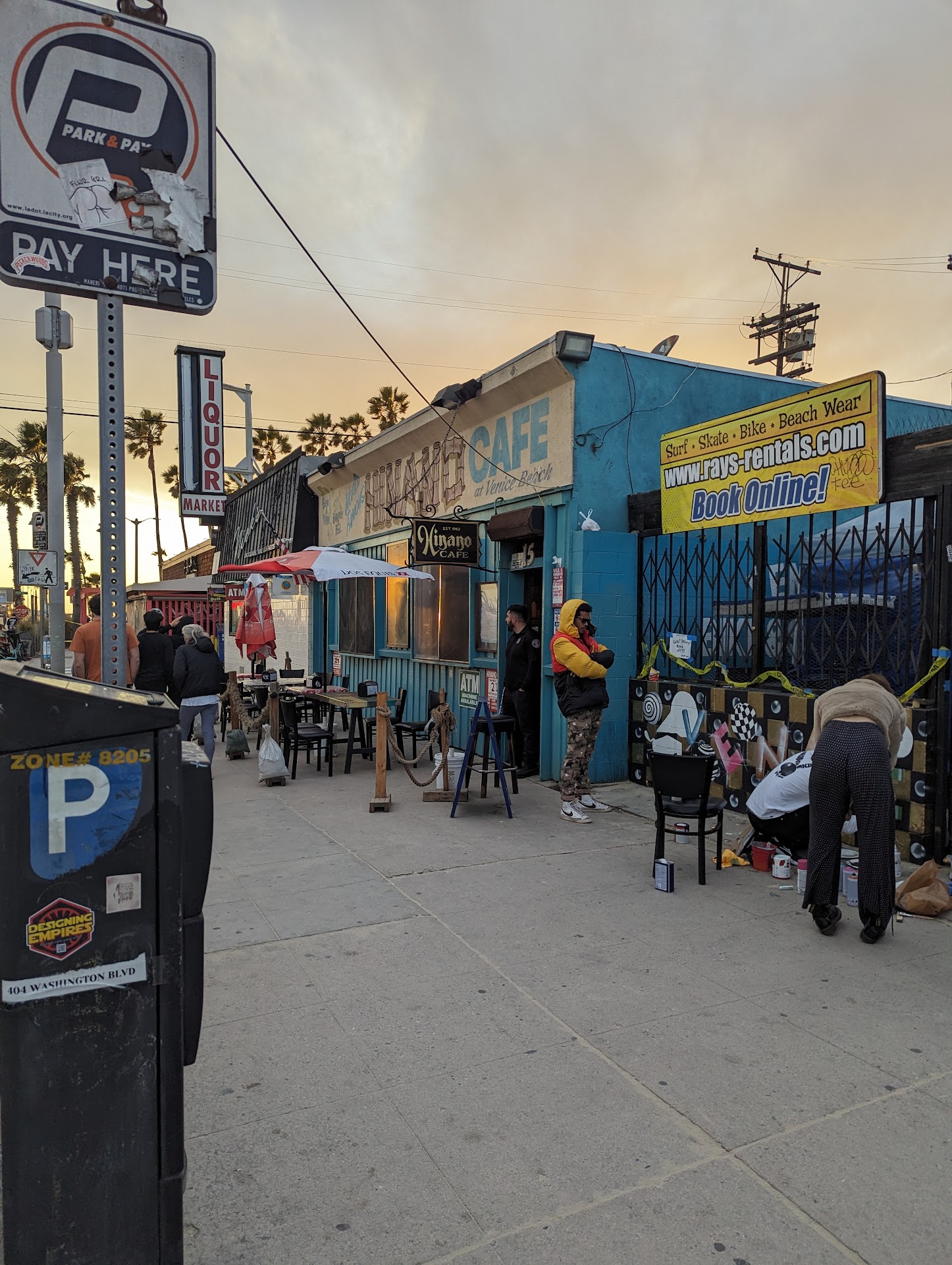 This cafe is really better described as a classic low-brow bar and grill and is easily found near where Washington Boulevard runs into Venice Beach, not far from Marina del Rey and Santa Monica. It's a bit of a hole in the wall, but is known locally for its rather basic menu of hamburgers, including turkey burgers and veggie burgers. When I was there, they were playing a lot of 70s and 80s music, like Bruce Springsteen. It has a nice, genuine low-brow atmosphere. I selected the turkey burger and thought it was rather tasty. and thought it was tasty. The staff was friendly and attentive and made some excellent recommendations about the local beers available on draft, including a rather excellent local pilsner whose name I didn't catch. Parking isn't too easy, without having to walk a ways, but it's manageable. There are multiple TV monitors, making watching football easy and enjoyable. In general, it's a good value for money and the experience overall was very positive. I would recommend for almost everyone seeking a low-brow experience. The one negative that I noticed was the restrooms, very small and dilapidated, but you could argue that this is part of the low-brow these patrons...