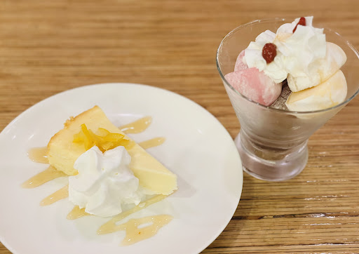 To finish off, I had dessert: a slice of cheesecake with whipped cream and citrus zest, plus a parfait topped with mochi and whipped cream. Both were light, refreshing, and the perfect way to end the meal.