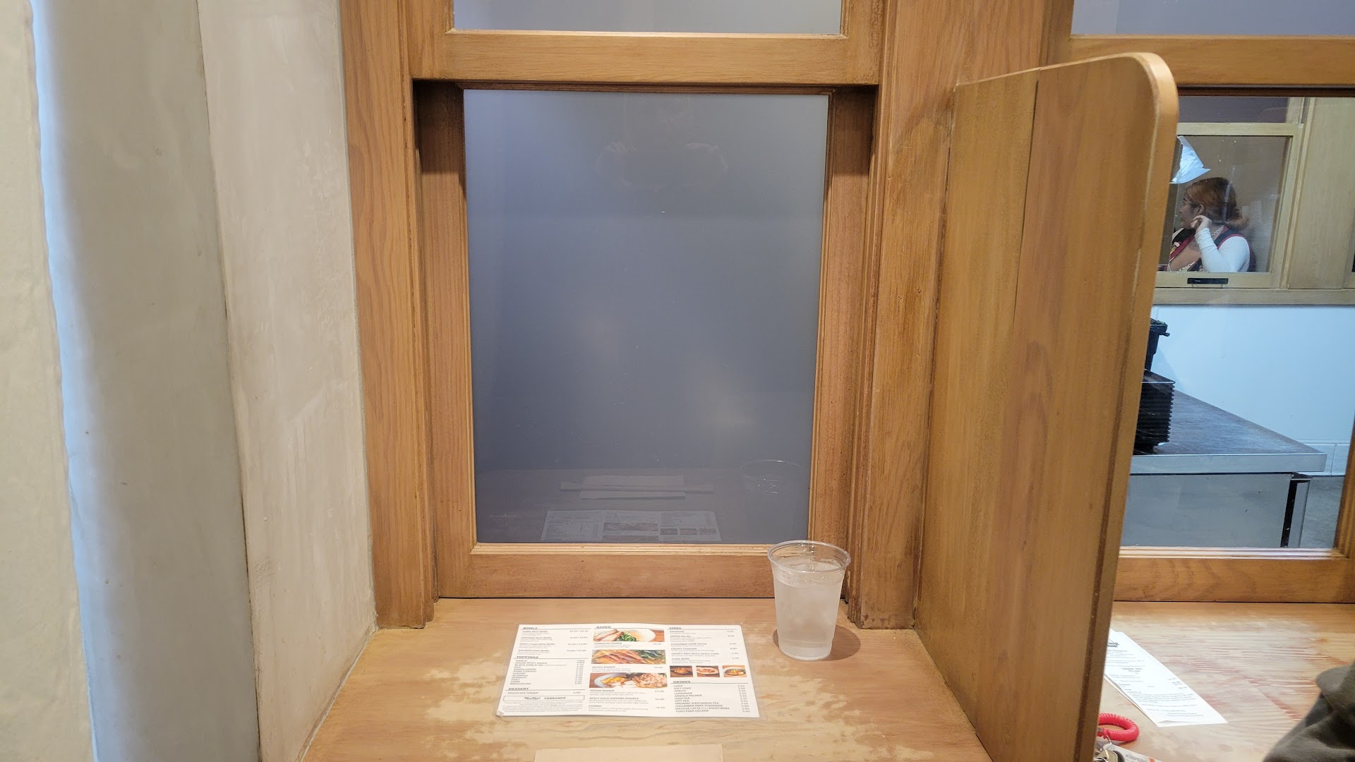 I eat solo a lot because I travel for work. I checked in and they brought me to a wooden counter with boards separating me from my neighbor, facing a frosted glass window 18 inches away. Nothing like making your guests feel more isolated than they already do. A menu was on the counter, along with some water in a plastic cup.