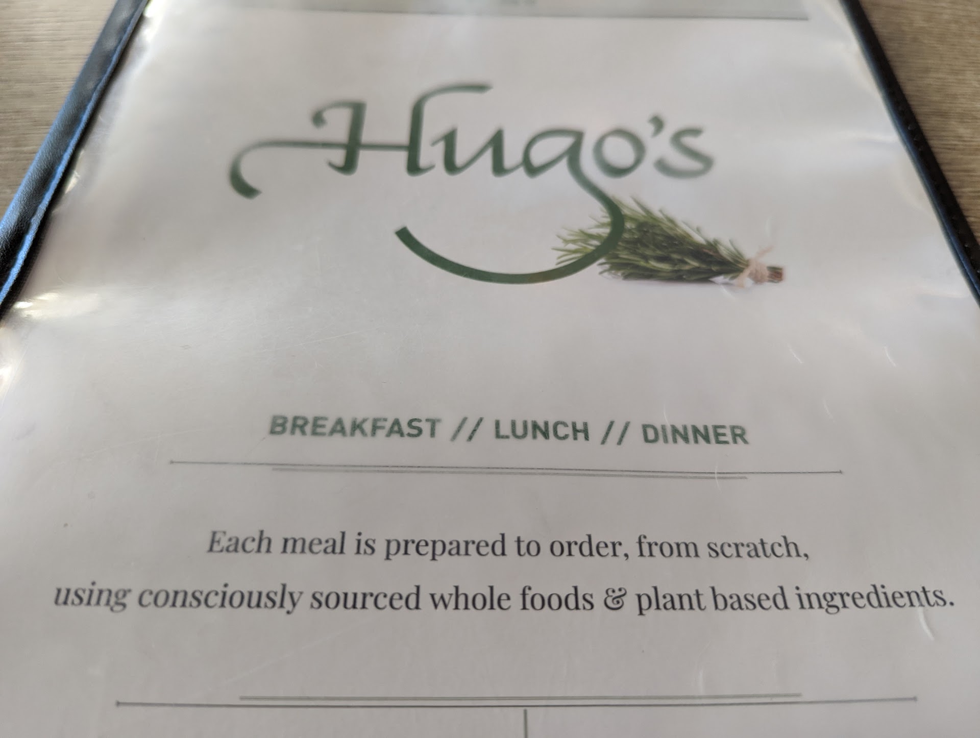 Most selections are annotated with dietary information. Often, conventional, vegetarian, gluten-free, and vegan versions of the same entree are offered. Many of the vegan meat analogs are made in Hugo's kitchen. While there are differences, these alternative, meatless, comfort foods provide much of the taste, texture, and "mouthfeel" of the originals.