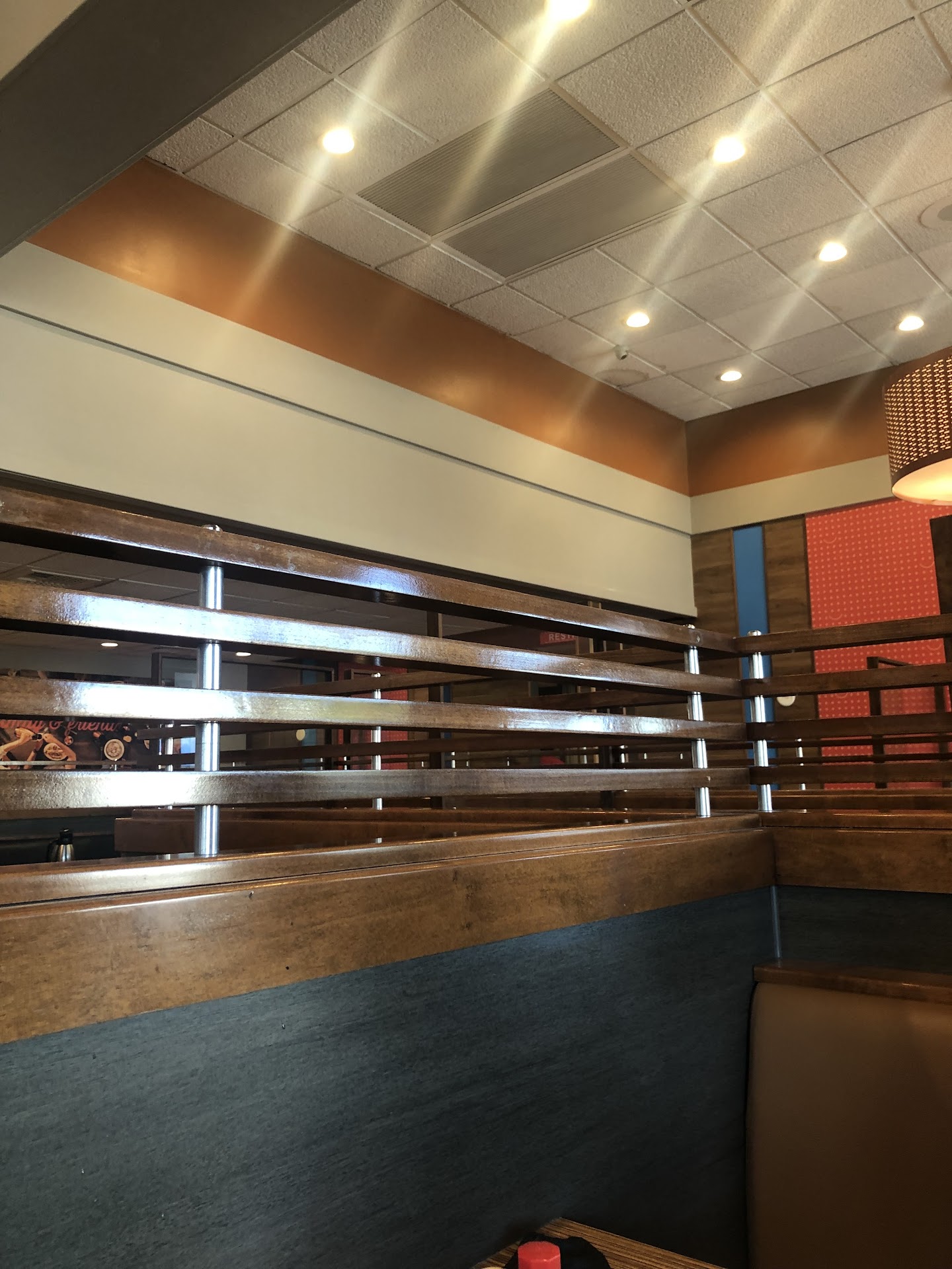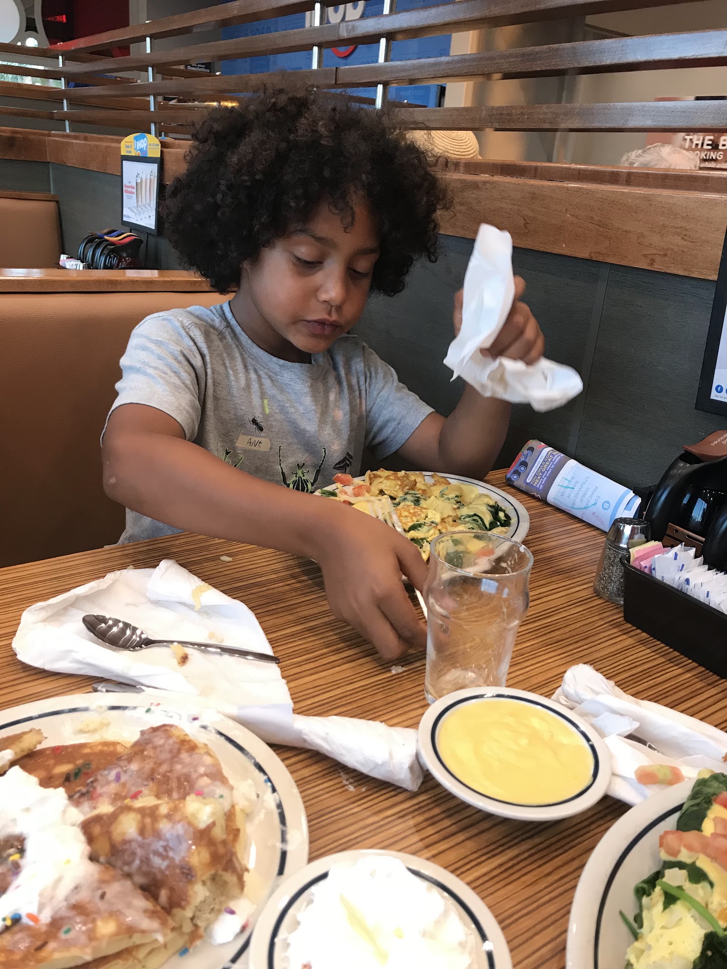 We finally just sat at a table that was somewhat clean we waited for someone to come and ask us for drinks we waited for ten mins. Then we just ordered then because my girlfriend and I get the same thing every time we split a shortstack that's it simple we never get menus because we are in and out.