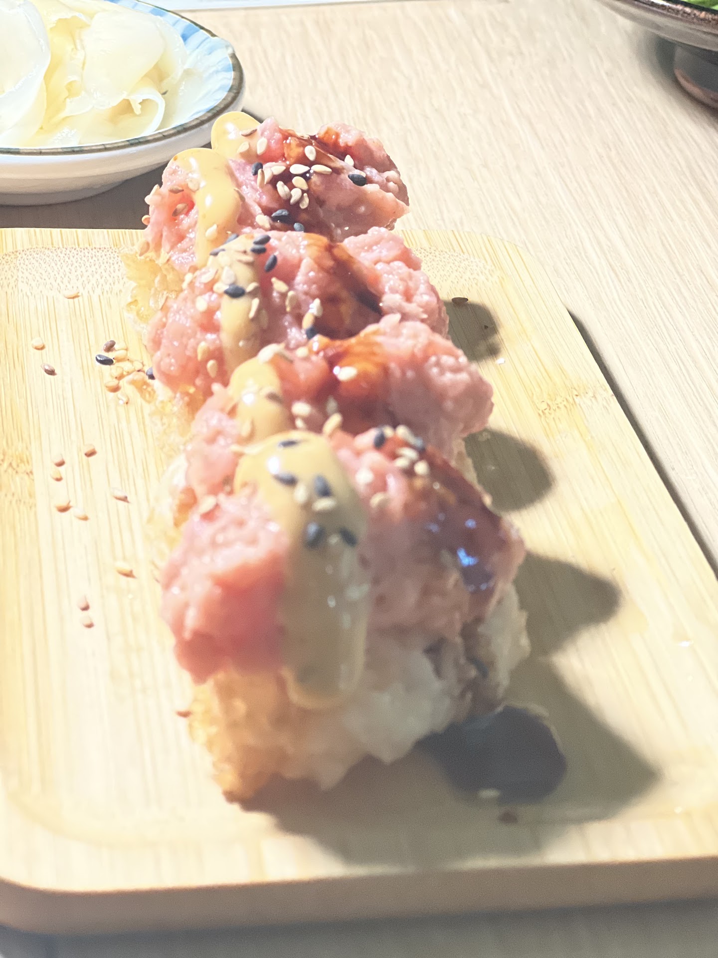 Hi. I made a reservation at 7:30 and delayed 8:00 . I've excused them on time. I've asked the window side table and I had to wait 30 minutes....that's was my first impression.... Still decent interiors and young vibe also very clean set up. First I've ordered edamame and salmon truffle burrata carpaccio and scallop carpaccio. Scallop was very fresh and made it quite Japanese discrete dish. And the salmon burrata was me and my love's favorite. Both we super love burrata and Iki's pickled cherry tomatoes were little kick. And the arugulas were finishing the umami!! Good job on this... Crispy rice with tuna, the crispness from the outside of the rice and inside tenderness was legit! And chopped tuna was fresh enough to enjoy. But I recommend not to use spicy Mayo, I'm a master chef in French Italian and Japanese... Sp Mayo killed the savory tuna taste...