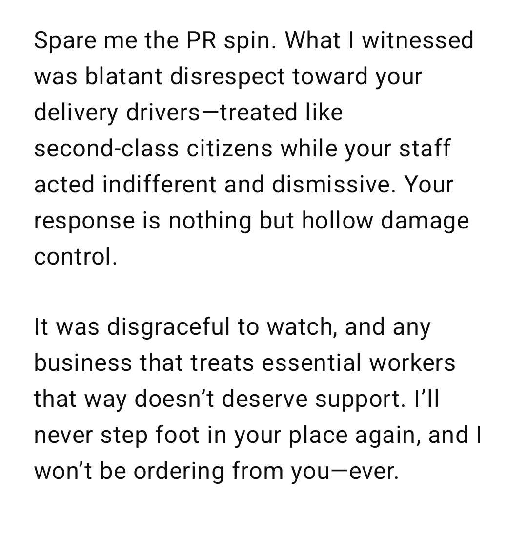 Watching this blatant disrespect toward people working hard to fulfill food orders was infuriating. These drivers are the backbone of food delivery — they deserve courtesy, not cold indifference.