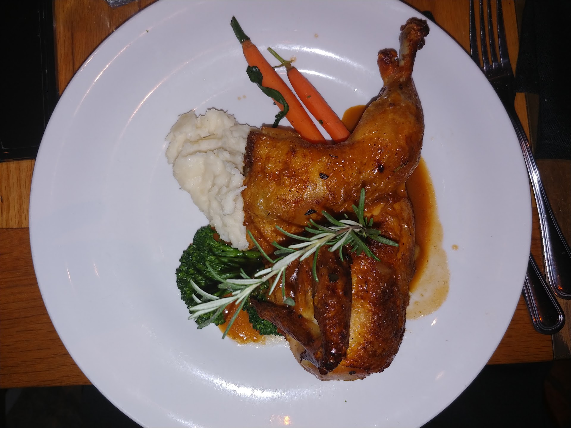 The presentation of the food was adequate, but I really don't base my ratings on how the food looks unless the appearance itself makes me not want to eat it, so that really wasn't an issue. The portion was very small. The chicken you'll receive is a single piece of breast connected with leg and thigh to give you both white and dark meat (1/2 chicken). This sounds like a lot, but the size of the chicken is rather small, so you end up really wondering where the rest of the bird is. The answer to that question is...it's on someone else's plate whose paying another $25 for the same dish. There was a stem of rosemary sticking out of a puncture in the skin (presumably to improve the appearance of the dish), but it was not separated from the stem and used to season the chicken. I don't know if they just expected the rosemary to be for looks or not as I ended up removing the rosemary from the stem and putting it over my food because I happen to really like the flavor of rosemary on my chicken. The chicken itself was seasoned adequately and the dark meat was properly moist, but the white meat was dry and overcooked. Quite honestly, I'd have been more satisfied if they had purchased a rotisserie chicken from Costco next door, cut it in half, and put it on my plate instead. In that case the portion would have at least been enough and the flavors at least as good.