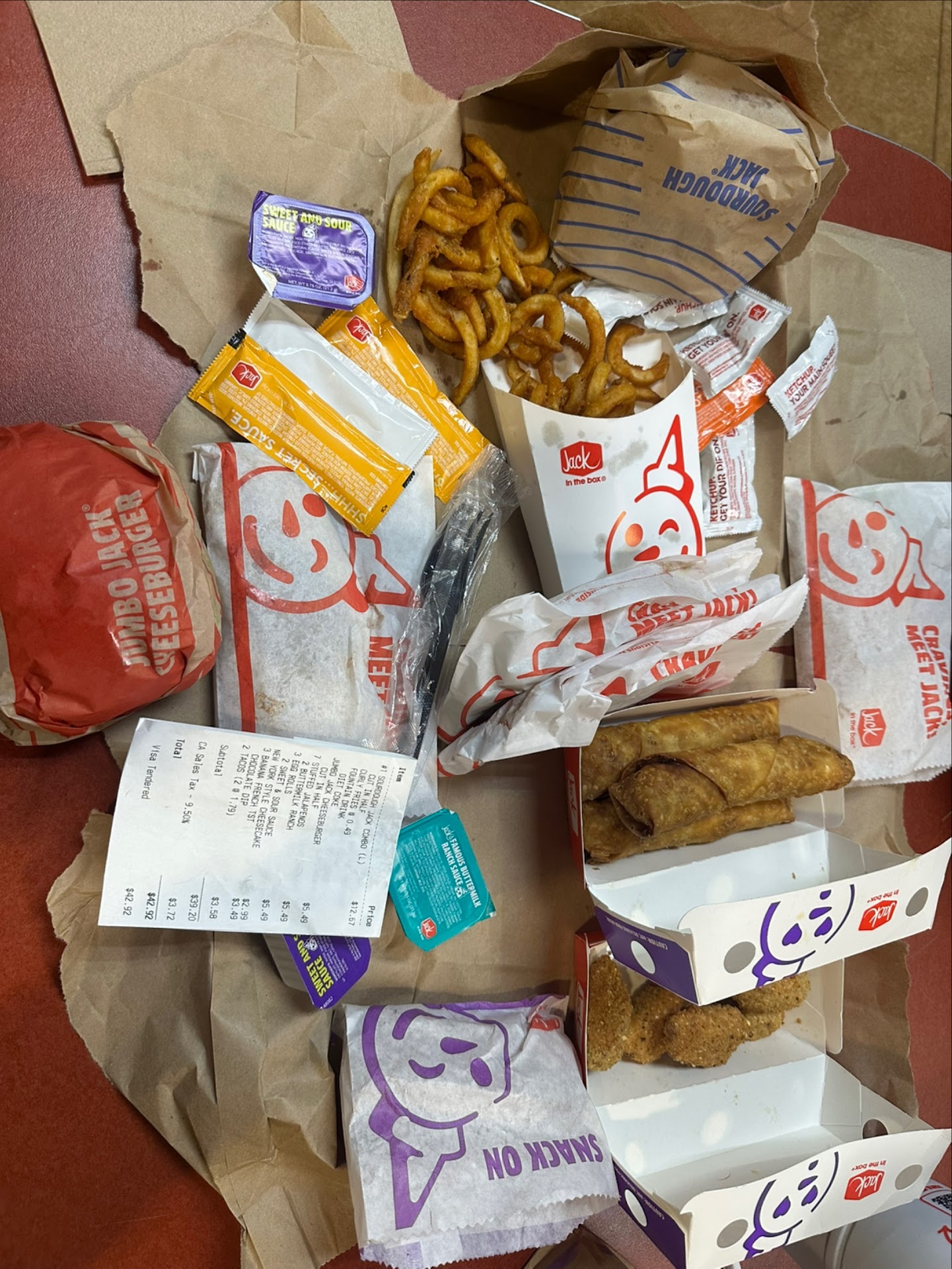 Read moreTwo of us were on a venture for some fast food and ordered $50 worth of food. We dined in so we were pretty patient. Like i said, i love jacks and my friend never had it so we came here for a little adventure. We were in good spirits, so i cant see how the girl hated us so much. We got our food with a bunch of stuff missing. No napkins. No sauces. No utensils. Nothing. Im not even talking about extras here. We got french toast that was supposed to come with dip. Didn’t get the dip. It was the limited banana frnch toast PICTURED WITH THE DIP. No forks for the cheesecake. Sweet n sour for the eggrolls? Nope! No ranch. No taco sauce. Forget the extras. This stuff should’ve come with what we ordered. Got NOTHING.