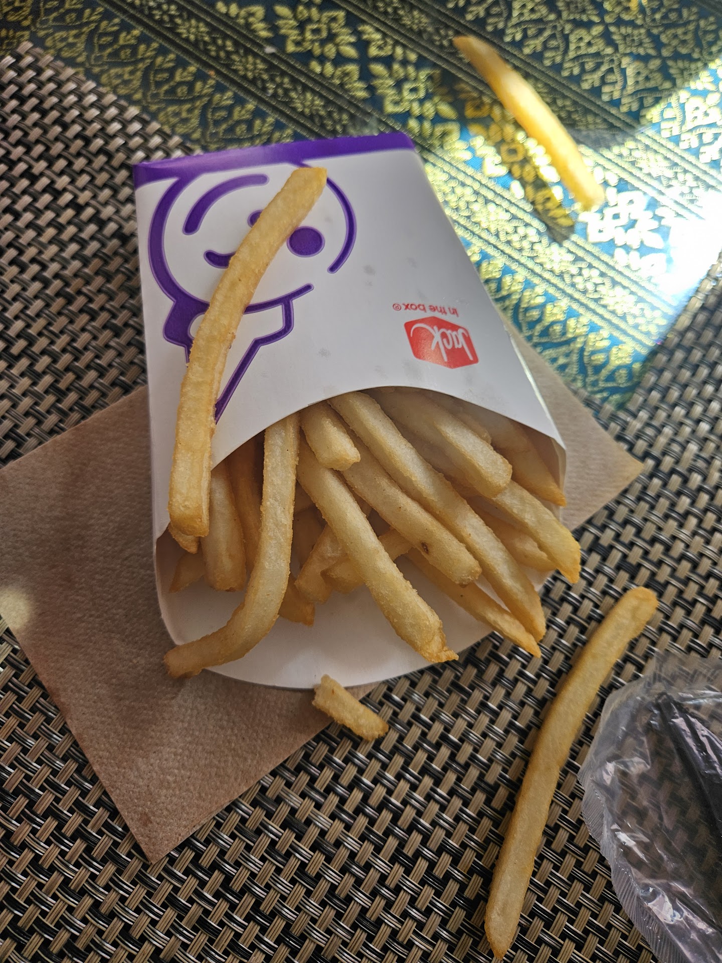 Read moreI stopped by this Jack in the Box today to take advantage of my tmobile Tuesday coupon on the jumbo Jack burger. I pick this location because it was on my way back from work. I put in my order over the mobile app and selected a later time. I also got my wife her spicy chicken sandwich, stuffed jalapenos and got regular fries for myself. When I arrived at my pickup time, I was planning on going inside but there was a large moving truck that tooked up the whole parking spots so I had to go to the drive thru line. There was 4 cars in front of me so I had to wait. I just told the person in the drive thru that I was picking up a mobile order. She give me my order quick and I went home to eat it. My fries were basically cold and not warm or hot at all. My jumbo Jack burger, my wife spicy chicken sandwich and her jumbo Jack was all warm so I knew it was fresh. The fries on the other hand I believe just sat out and was not freshly made or put in a warm area to stay fresh so the fries were not good at all. You can see in my picture that the fries were all stuck together when I pour them out on a plate. My jumbo Jack was fine and I customize it. My wife like her spicy chicken sandwich and stuffed jalapenos. I asked for three buttermilk ranch and three ketchup packets when I placed my order, I only got 2 buttermilk, a bunch of ketchup packets and a bunch hot sauce packets for some reason. I would recommend you check your order before leaving and if it's cold then ask for them...