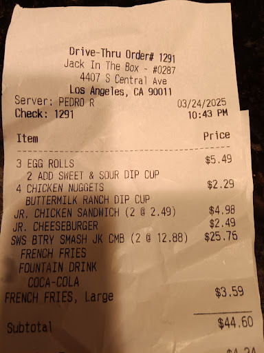 Read moreThe place was really rude I get off of work to get some food and they talked to me with distain because of my dirty clothes and hands I’m a mechanic and then watched as the people who spoke Spanish get extra sauce no charge and when I asked for ranch no ketchup on the order they then ask to charge me again when I had placed my order with the ranch I am pretty sure they assumed I didn’t speak Spanish because I understand everything when they talked down on me while eating my food and then she he customers after me joined in saying I smell in Spanish and I hear them ask for sauce and was not charged like I was it was horrible experience an if I could give less stars I would and best believe I’m putting this on the jack...