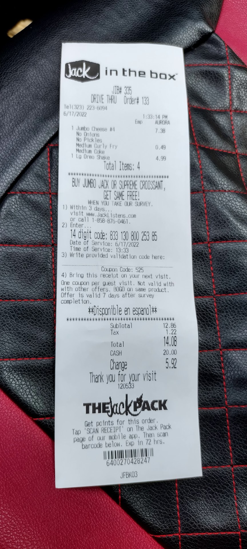 It's no different than any other jack in the box,.. but I ordered 🌮 taco's,. Always been my favorite,. And onion rings,.. that right there was their screw up,.. don't know if a manager was on hand but the way my onion rings came out of the freezer when they're all stuck together frozen,... Well I got them exactly the same way,.. they were not pulled apart like onion rings are supposed to be,.. I literally got one Big WHOLE chunky so called onion rings,.. if I tried pulling them apart it just pulled all the batter off,.. and it was that big to fit in to those boxes it comes in,.. so usually one onion ring would easily drip off excess oil,.. well this box was leaking with so much oil bcuz they put that whole giant piece in the box the same way it froze,.. not good at all!:! First time ever did I served a Giant piece of onion with batter pieces holding on to keep it together! VERY MESSY! I FORGET TO...