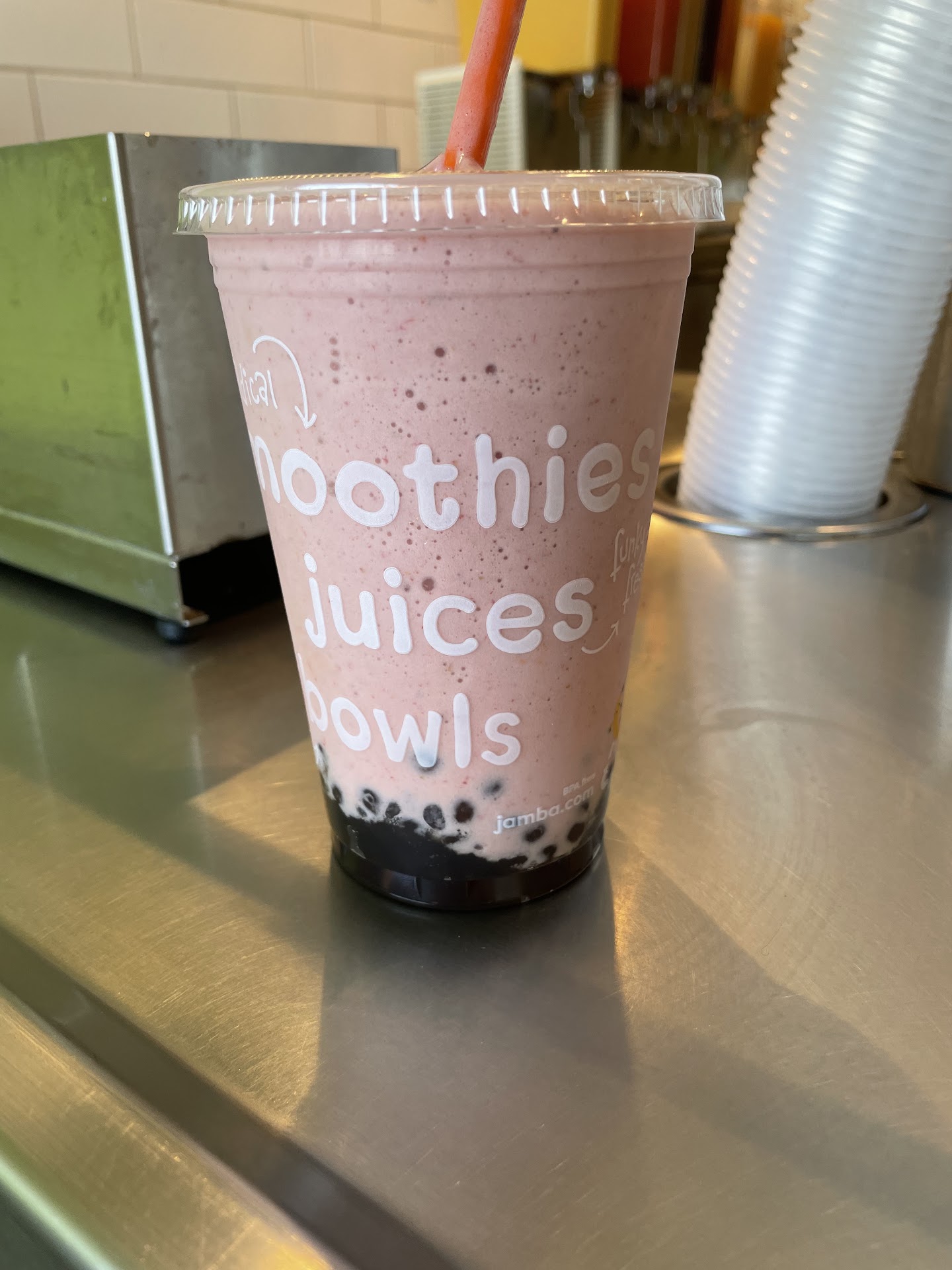 I came here after the gym and craved smoothies. I was hyped when I saw they have new options for boba since a big franchise like Jamba Juice to adapt and added to their menu, this is a big deal. So I wanted to try out, and oh no! It's terrible! I don't know how to explain it, but I throw it out right away from my mouth after I bite it. It was a weird feeling and texture since it's not chewy and hard to explain.