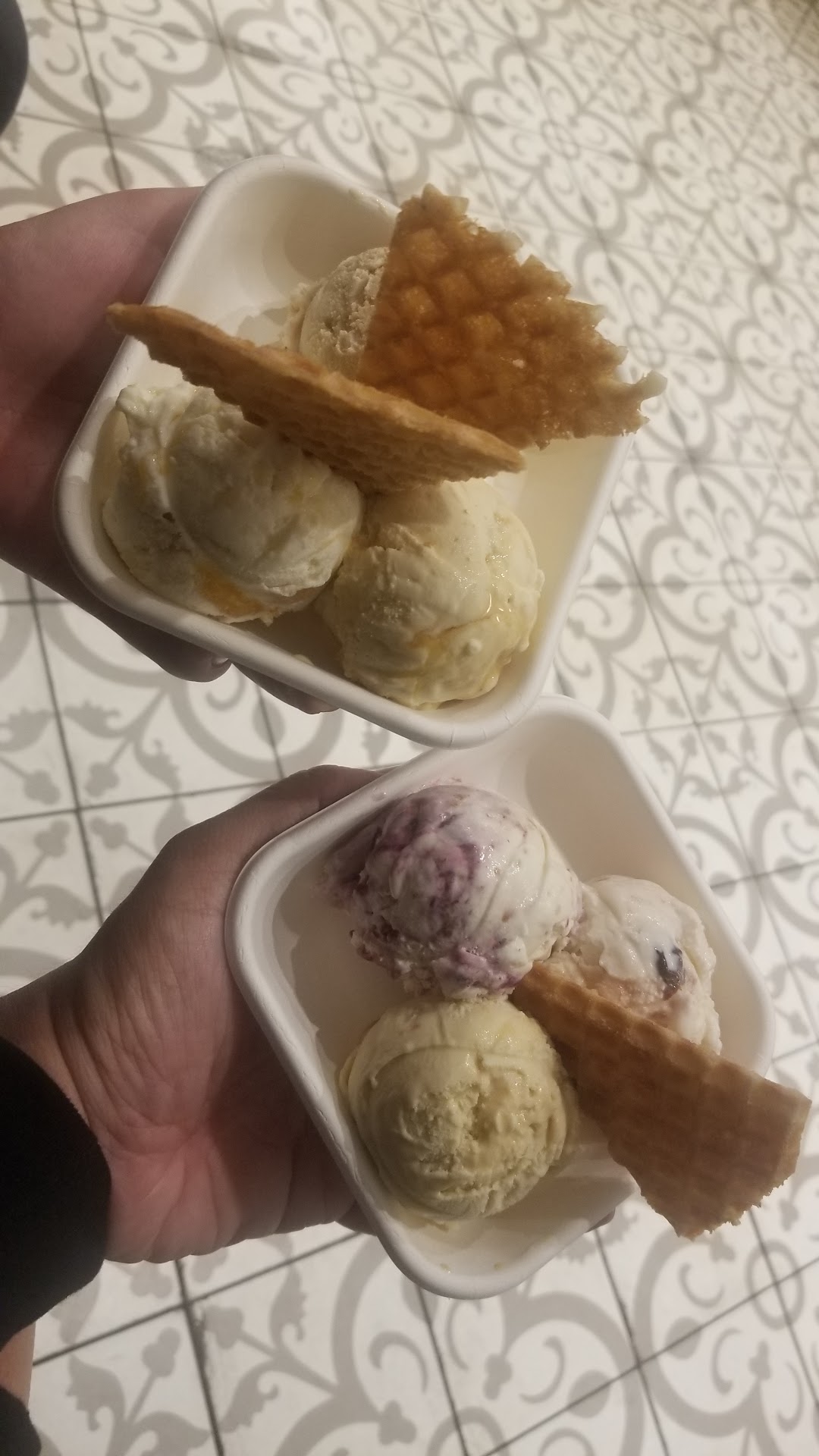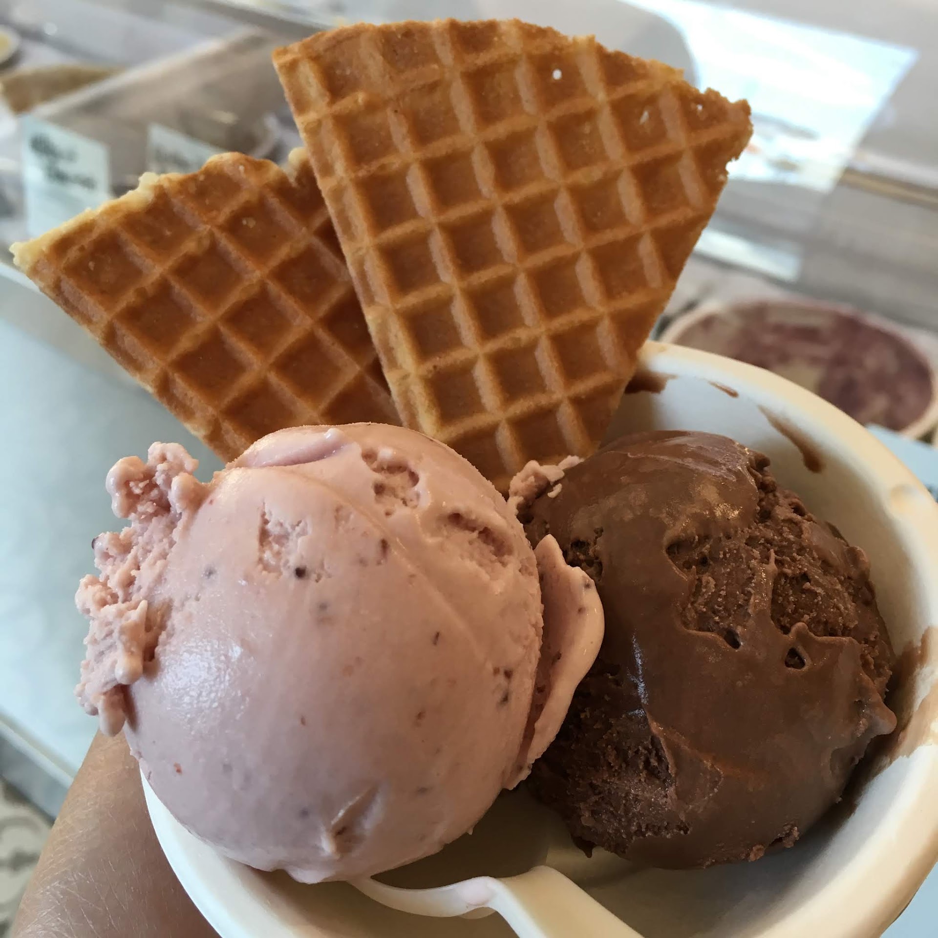 The cups of ice cream are served in little biodegradable bowls and spoons, finished with 2 triangle pieces of waffle cone. The ice cream is a little pricey side though.
