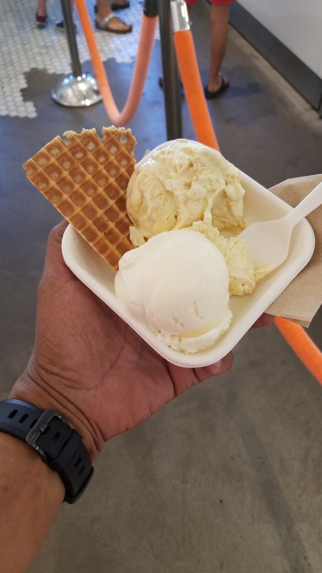 What I liked the most is that they have at least four vegan flavors. My recommendation is to get the Texas Sheet Cake and the Cold Brew with Coconut Cream. A particular thing you encounter at Jenni's is that the 'scoop' is actually 'a half of a scoop for you', and this is confusing and smart at the same time. I believe this concept was designed with marketing purposes in mind. The 'scoop' is designed for their understanding of a scoop, not yours, but what you see while the kids are serving your ice cream is that they are putting two scoops. Think about this: When they call it a scoop, in your mind you must have 'a half of a scoop', but leave this in your mind, don't say it because you will be creating a mess. I'll give you one example. If you want to try two flavors, ask for a scoop made of Cream Puff and Dark Chocokate Truffle. The kids will put a scoop of one flavor on the cone, followed for a scoop of the other flavor on the same cone. In their mind, they are giving you 'a scoop'; in your mind, you are seeing that they put two scoops. What they see is that the whole amount of ice cream given is A SCOOP. In order to avoid confusion, try to see that the total amount of ice cream they put on your cone is called A SCOOP, even when you saw they put two scoops. As I mentioned, I believe Jenni's did that to give the impression that in a scoop, you can get two flavors. Today I ordered two scoops of two flavors and what happened was that the girls put two scoops of chocolate in a waffle bowl plus two other scoops of another flavor and charged me for two scoops, no matter that what I saw when leaving the store was a bowl with four scoops. If you don't like my review or you don't understand it, please don't blame it on me, blame it on Jenni's for calling two scoops,...