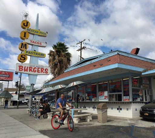 Burgers and food are supposed to taste different EVERYWHERE... idk why peep are complaining about the food here. Jims has some dishes that they make well, such as their teriyaki and pollo asado, as for their burgers, you have to acquire a taste for them. I enjoy their chili fries with onions(acquired taste) and they do have some yummy breakfast plates like the corn-beef n hash#hard to find. The thing that keeps me comming is the Coke. They have crushed ice and styrofoam cups which make the soda taste BOMB!! Gave it only four stars because I HATE the tables there. Very uncomfortable. They used to have booths which are preferably comfy and add a touch of welcome to the place, but since they placed these hard chairs and ghetto tables, I hardly ever go. Spend some money and remodel the place with cushioned booths JIMS!!! Clean those floors and windows tooo!!! Needs new management. This would be a great place if many of these issues...