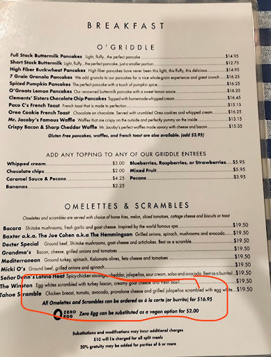 Edit: I found a menu on someone else’s review as I did not get to take any photos. I circled what it says. When I ordered, she did inform me the pancake would be $5 extra, and the fries were $1.55 extra. Despite this, the total should have only been $23ish, but we were charged $27.50...