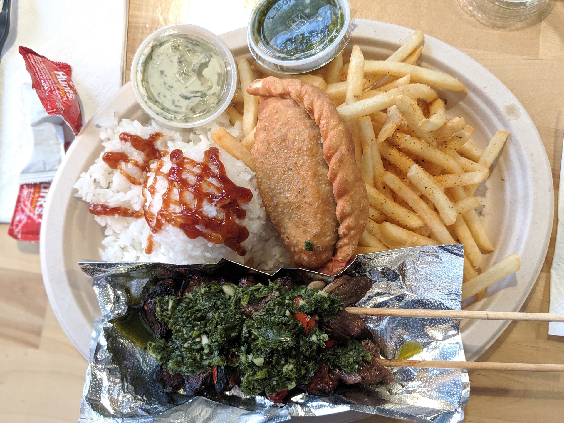 Read moreReason for visiting: lunch with co-workers Date/time of visit: Friday afternoon, lunchtime (before a long weekend) Parking: shared lot with other businesses, free. Party size: 8 Environment/ambience: chill atmosphere with 80s music and random videos playing on th wall. Theme is beach, surfing, canoes, etc. Black and white color scheme. Sign is black outside so it may be hard to see at night. Restaurant is super clean, so is the restroom. Service: great. Order at the front and food is brought out to you. Food: had #2 combo: steak skewers with fries, one empanada (steak), rice (instead of salad), and cup of water (free). The food was great. The empanada comes with its own sauces: tartar sauce (?), chimmichurri sauce, and a mayo/ketchup dip (looks like thousand island). Portions are pretty good. Cost: not bad but expensive for a reg lunch; total for #2 with...