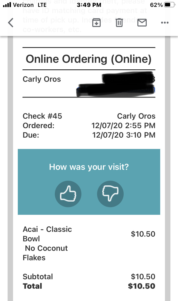Read moreI don't usually have a problem at this Juice Crafters location, but I am NOT happy about my experience today. I ordered online through their website for contactless pickup due to COVID guidelines. I was told my order would be ready by 3:10 pm. I arrived and my order was not ready. I didn't mind much, so I waited. However, then my order was made incorrectly. I asked for no coconut in my açaà bowl, because it is an allergy. My bowl contained coconut. I showed them my confirmation email that it said "no coconut" on it. I asked for them to remake it. They hesitated and looked at each other and said "we are kind of busy"...Unreal. I explained again that it was made incorrectly and let them know that it is an allergy. They remade it, and it's honestly the worst açaà bowl I have had here. The açaà was so frozen I had to let it sit and thaw in the car before I could eat it. This place is not cheap, so I expect top service and product. I come here often, as well as the Hollywood Blvd location, and have never...