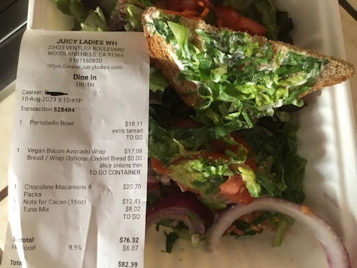 A part of my neighborhood, I've eaten at Juicy Ladies, Woodland Hills many times throuout the years. The atmosphere is one of a big living room, which is welcoming & fabulous. The food is generally tasty, BUT everything is expensive to the point of unfairness. Today, 8/10/23 is the second time recently I ordered their $17.08 "Avocado/ Bacon Wrap." A few days ago, I left a complaint for the manager that the Onions were in such huge chunks & so abundant that it was like an acidy Onion Sandwich. Furthermore, there was les than 1/16 of a small Avocado sparingly on the sandwhich.