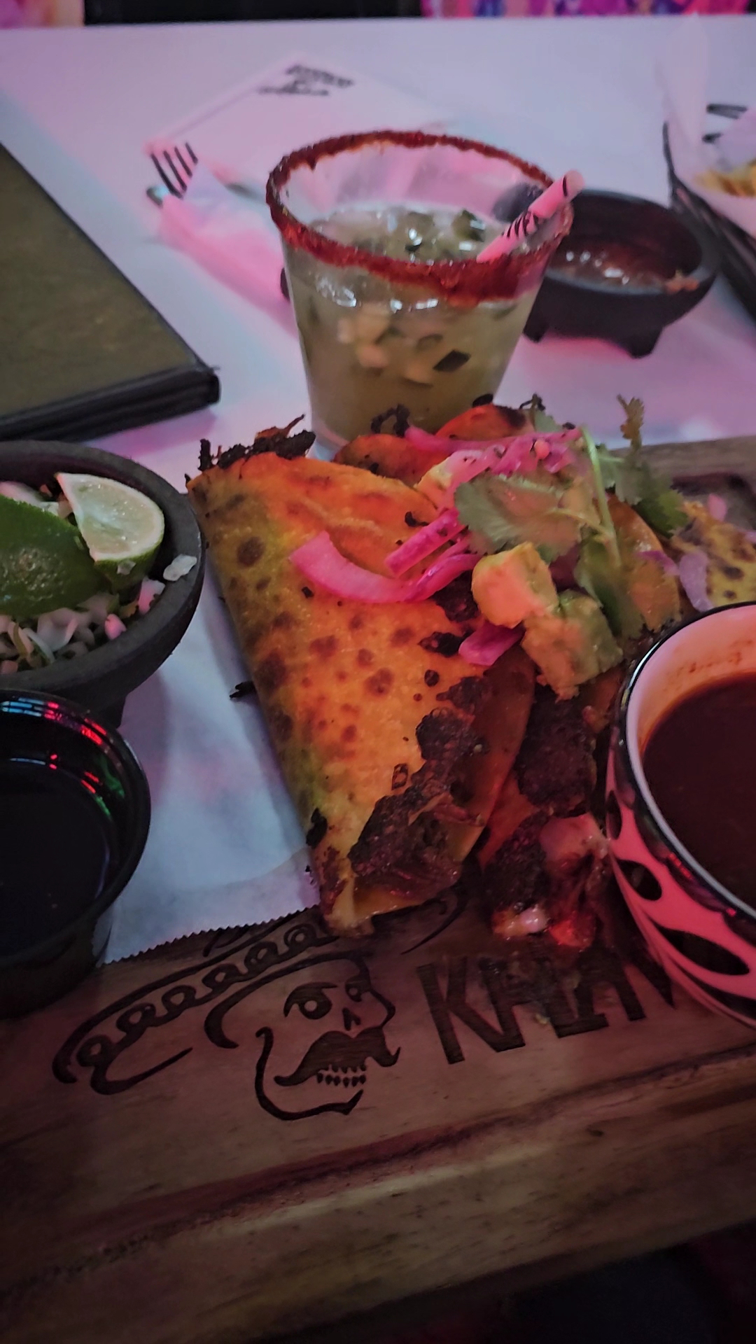 Stopped by during happy hour for a dear friend’s birthday celebration and had a great experience! Vivid, vibrant cantina vibes with a Dia de Los Muertos theme, lively music, homemade syrups for their drinks, and an eclectic mix of dishes on their menu!