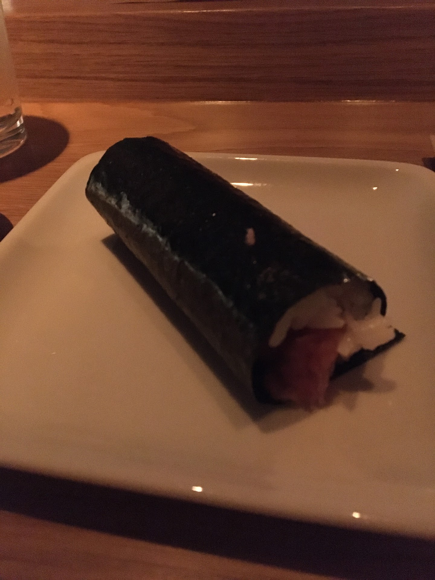 Perfect for the none sushi eater, a handroll is pulverized raw seafood wrapped in seaweed. Usually, at every other Japanese restaurant, this means tasty sushi-grade fish/seafood with a balance of ingredients such as vegetables, sushi rice, and possibly other creative items to offer a delectable combination of flavors wrapped in an easy-to-hold cone shape of Nori. Well, this is not what you will get here.