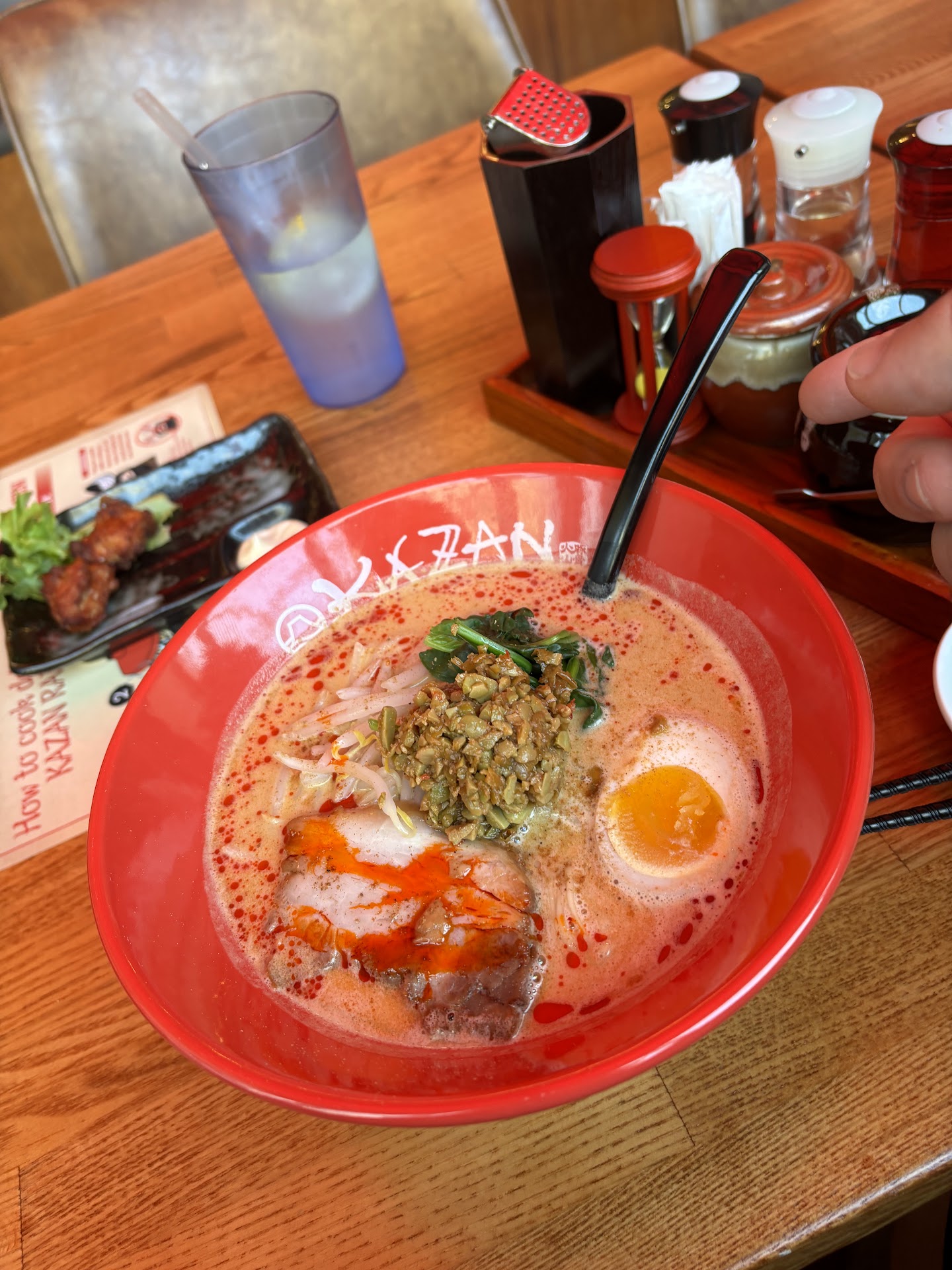 You have to have the volcano Ramen dessert dish, but I tried the lunch special which for $17 you get a bowl of Ramen plus a side dish! And the idea of Ramen being a full-blown meal has occurred to me since college but I did not regret eating here the service is great. The atmosphere is incredible. The seats are comfortable and there’s outdoor seating as well as indoor. The bar is massive… But the soup? Or the Ramen? Was unreal. Good I loved it so much. I wish I wouldn’t eat so fast.!