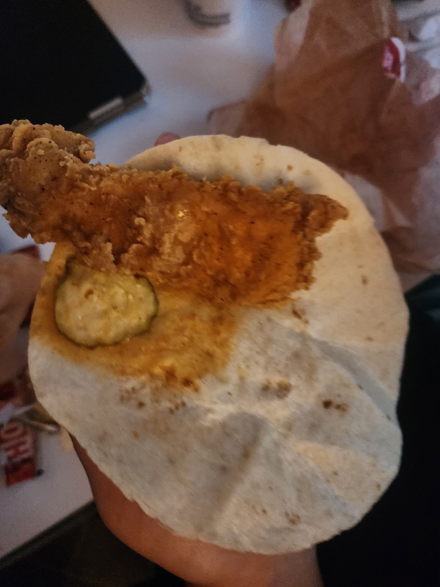 Read moreI ordered though drive thru, the cashier was nice and I thought the experience would be great but then I got home; and It was my first time trying the wraps, my first impression was that they were not what I thought! They were small and not worth $9.99 for a combo + tax. Not to mention the portions were horrible, one big piece of chicken and little to no mac and cheese. As for the spicy slaw one, I noticed it was missing the slaw and then it was one SINGULAR pickle!! I was utterly disappointed. Never again!!! $21 for two...