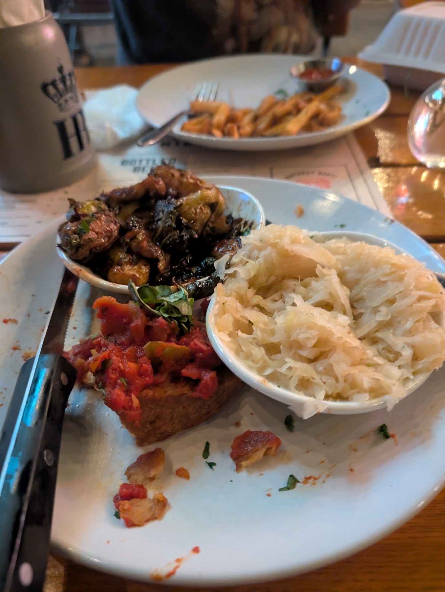 The vegan schnitzel came out as a small, extremely thick & flavorless cutlet / puck - a far cry from the flat, breaded, authentic-looking version offered to meat eaters. To add insult to injury, it was topped with a chunky sauce that tasted like canned tomatoes and little else. Brussels sprouts were mealy, soaking in oil, and unusually bitter. The "German" fries were anything but - not traditional pommes at all, but over-fried, coated in seasoning, and cold on arrival. All around very disappointing and inauthentic.