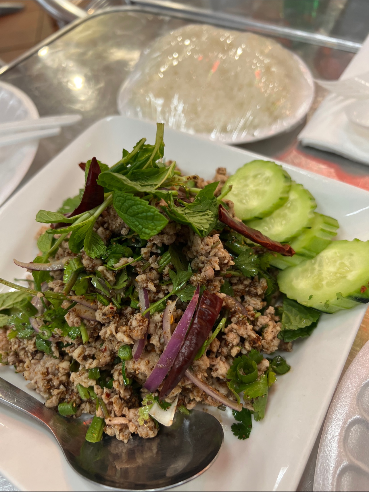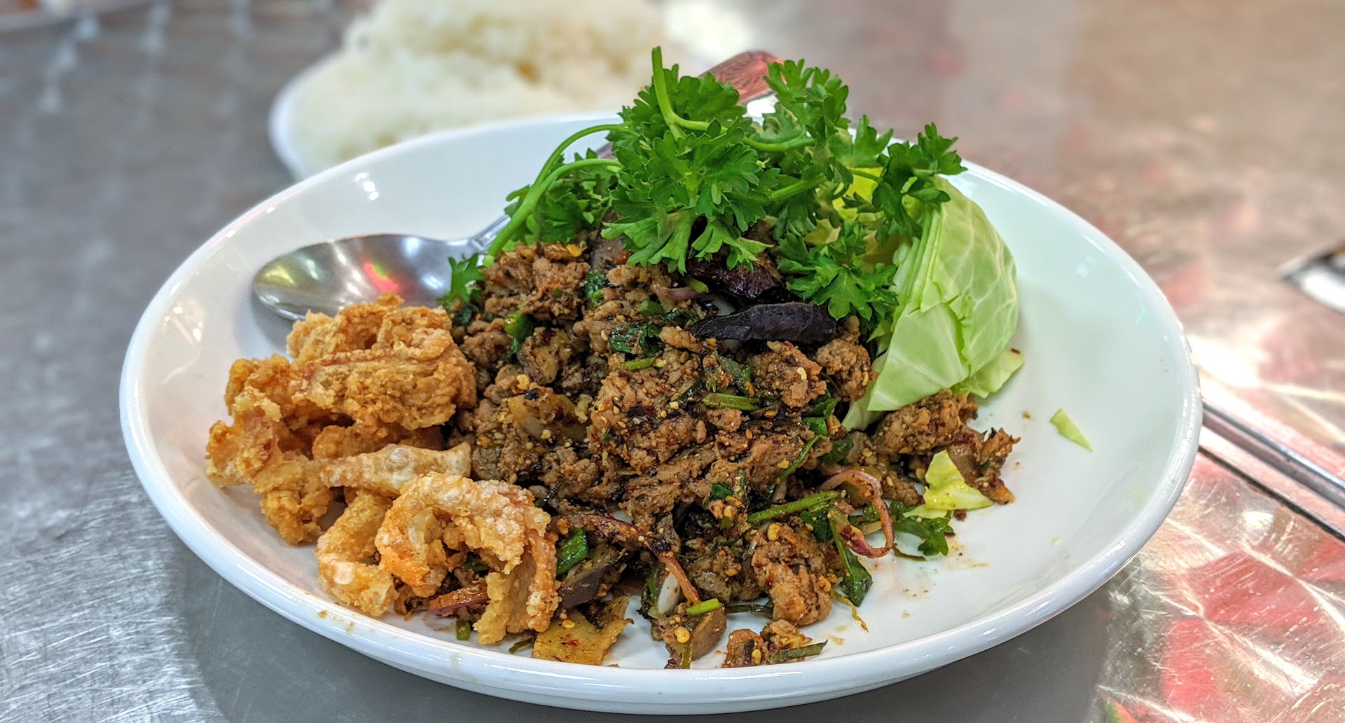 This meal started with a delicious plate of naem khao tod ($10), which immediately went to the top of the power rankings with the one at Vientiane down in Garden Grove. In addition to the rice cooked with curry paste and sour sausage, they include peanuts and roasted chili peppers. Freshly chopped up ginger seemingly pervades each and every bite in...