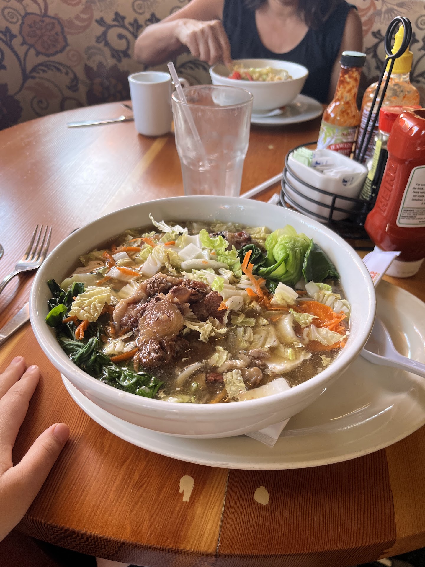 Read morecame for breakfast but wasn’t craving breakfast food, so i was happy to see that on their “lunch/dinner time only” menu there were plenty of *served all day exceptions. it’s not super obvious so look out for that. i was served the biggest most delicious bowl of soup that i’ve ever had the pleasure of eating. highly recommend the oxtail saimin, so flavorful with plenty of meat. but putting the left overs in a to go container definitely made a mess. i also had orange juice that tasted very fresh and my mom said her coffee and meal was very good. took a slice of cake home from their bakery to share and it was excellent....
