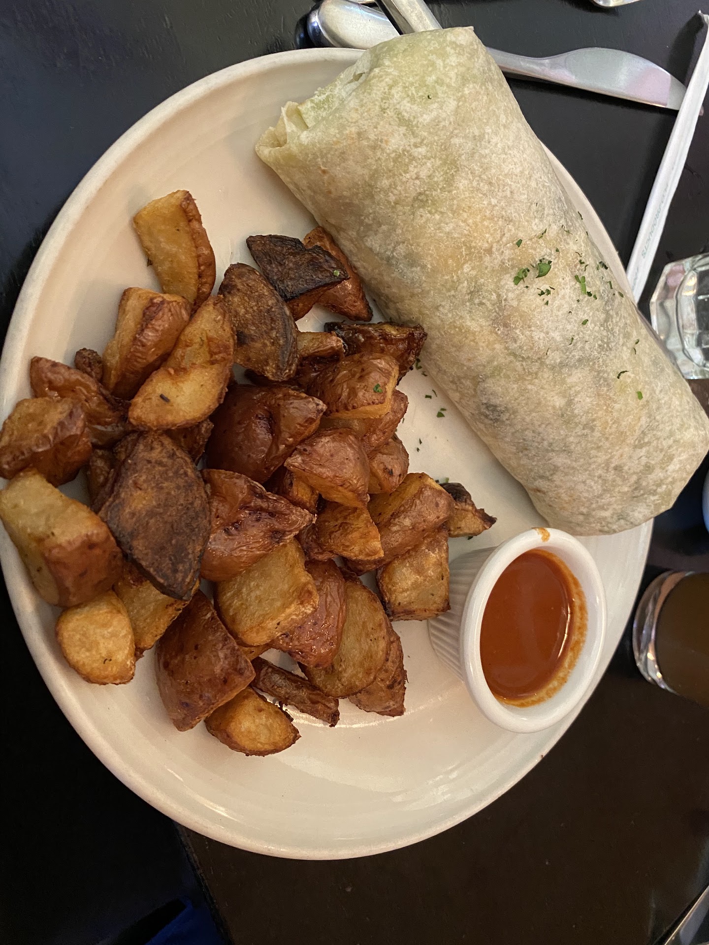We had 2 people serving us, a man and a woman, and they were both great. We sat on the cafe side (there is also a restaurant side), which is quieter and you can spread out more...also a TV with sports...the French Open was on. The food was excellent and the atmosphere was...