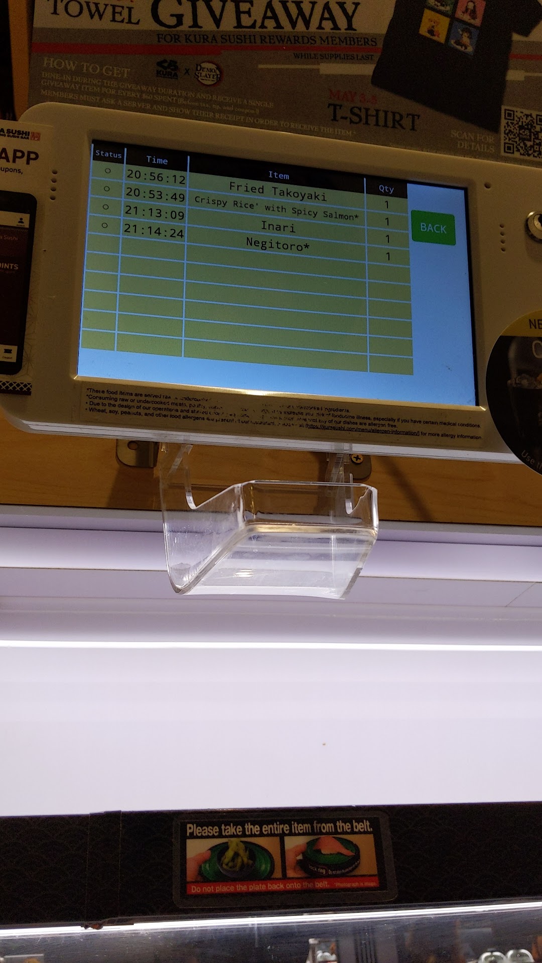 Read moreSeating partly drives this novel culinary experience. Yes, ymmv greatly. You may get lucky and sit where the plentiful options are refreshed by the kitchen or, you may find yourself stationed in the doldrums where the fishies and more desirable selections have been picked clean leaving lesser sides at best. The fellow dinners are a variable, but only nominally. Multiple people will want the same thing. It's can have the effect that one side of the restaurant may have slimmer pickings. The chance that enough then the other people sitting ahead of you on the conveyor belt, all wanting the same dishes as the other patrons. This flaw could be fatal and to some that have watched as a slew of open domes pass furtively by, quite devoid of highly desirable tasty morsels, it's discouraging enough to opt for standard Sushi. Indeed, better quality and lower prices are available but none with an exquisit zeitgeist as Kura Revolving Sushi Bar. The business model supports the unavailable options as a risk mitigated by a decent menu for kitchen orders.. by ensuring what options are available are worthy of seconds or a return another day. There are multiple dishes, let's say 30+ different plates, so it's more likely you don't get to try all the options anyways. There is some validity to the FOMO culture and a conveyor belt which may have only empties could fuel some ire... It must be said, the Kura of today much improved. More options, better quality but still only a few bites per plate. At $4 per plate, that small amount adds up quite quickly. $150 for two on a non-date night could've been better for better fare on the best of experiences. Woe betide a lackluster showing of cuisine. Worth the time at least once... Three times in so many weeks, and only one lackluster dinner course for one in the dinner party....