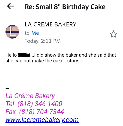 Read moreI called to ask if they can make a small 8'' cake for a birthday. The first person I spoke to said they could have it done by the time specified. The person said to email the details of how I wanted the cake so I did. The n later I called to confirm if they received my email. Another person answered. She said yes they received it and they would call me back after they spoke to the baker. Then I got an email that said that they spoke to the baker and the baker said they couldn't make the cake, 'sorry'. This response had no explanation as to why they couldn't make the cake when the design was fairly simple and they had the all the ingridients they needed as per the first person I spoke to. And I was willing to pay whatever price they asked. This is bad customer service and I'll never buy anything from this place in the future. Shows their...