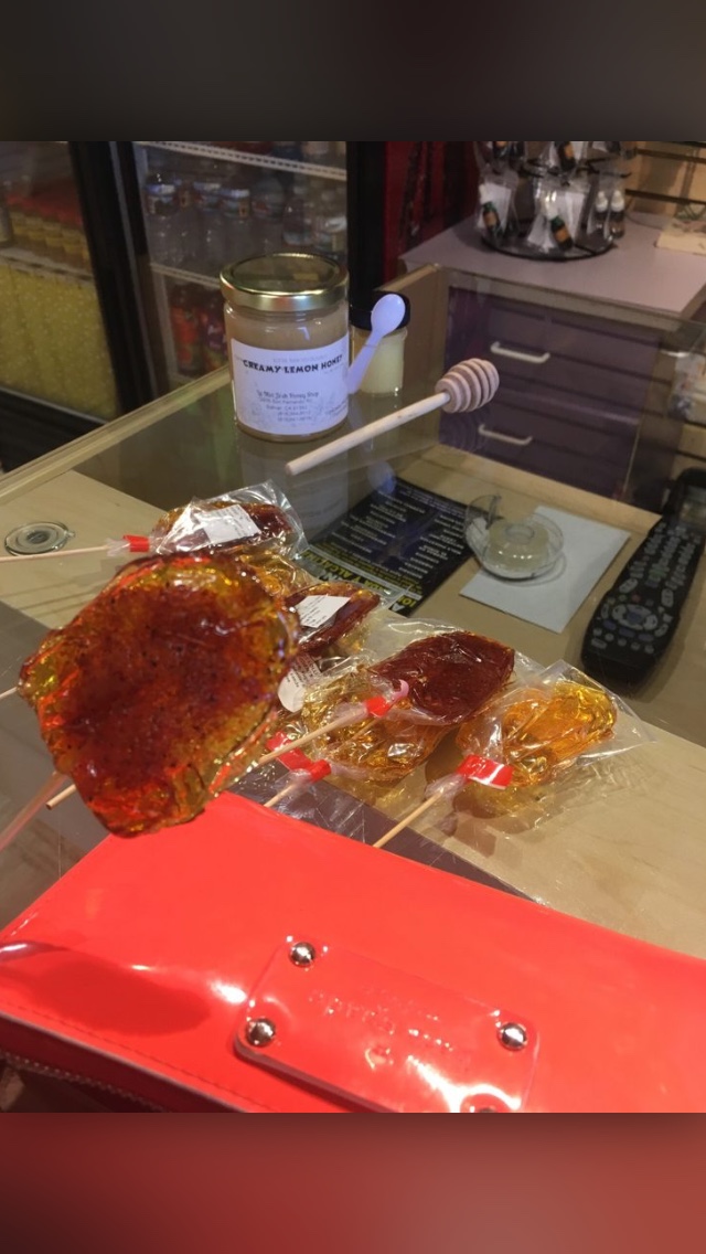 I ended up buying a bunch of honey lollipops and a jar of thick honey lemon spread....