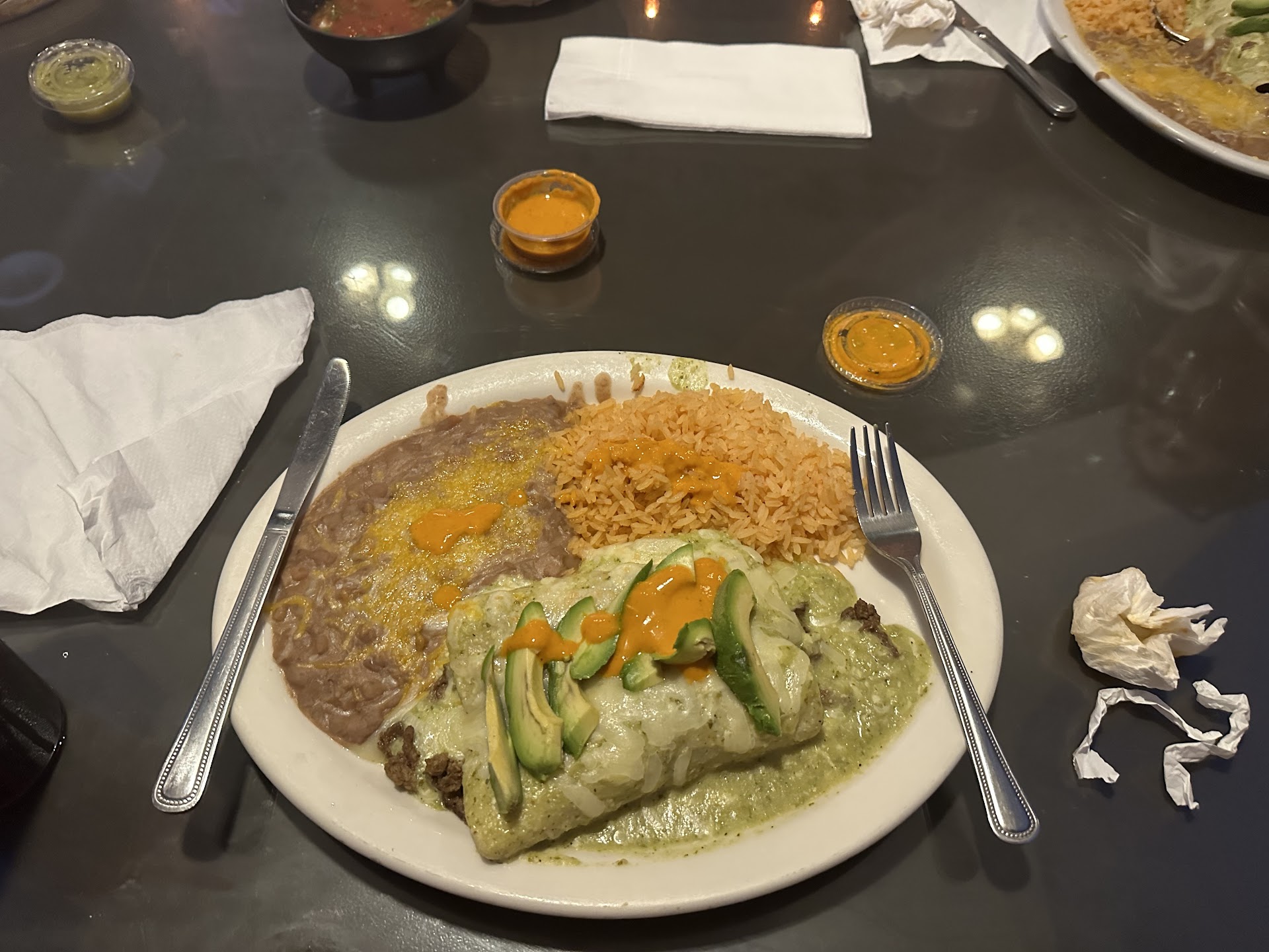 Looked for a Mexican restaurant after landing at LAX and found this one. I'm not sure why restaurants insist on playing music so damn loud that you can't have a reasonable conversation with someone sitting across the table from you, but that was the case here as well. It was aggravating. I had a wet burrito that tasted funny and was only able to eat about 4 bites before feeling not so good. My son also tried it and he agreed that it tasted funky. He had the papusas and they were much tastier. The weird thing was, before we were finished and ready to go, the waitress turned off the music and started turning off the lights. She never mentioned they were ready to close, but we assumed that's what they were doing so we rushed out of there. The gate gate to the exit was locked and we drove around to the other exit. Definitely not good enough to go out of my...