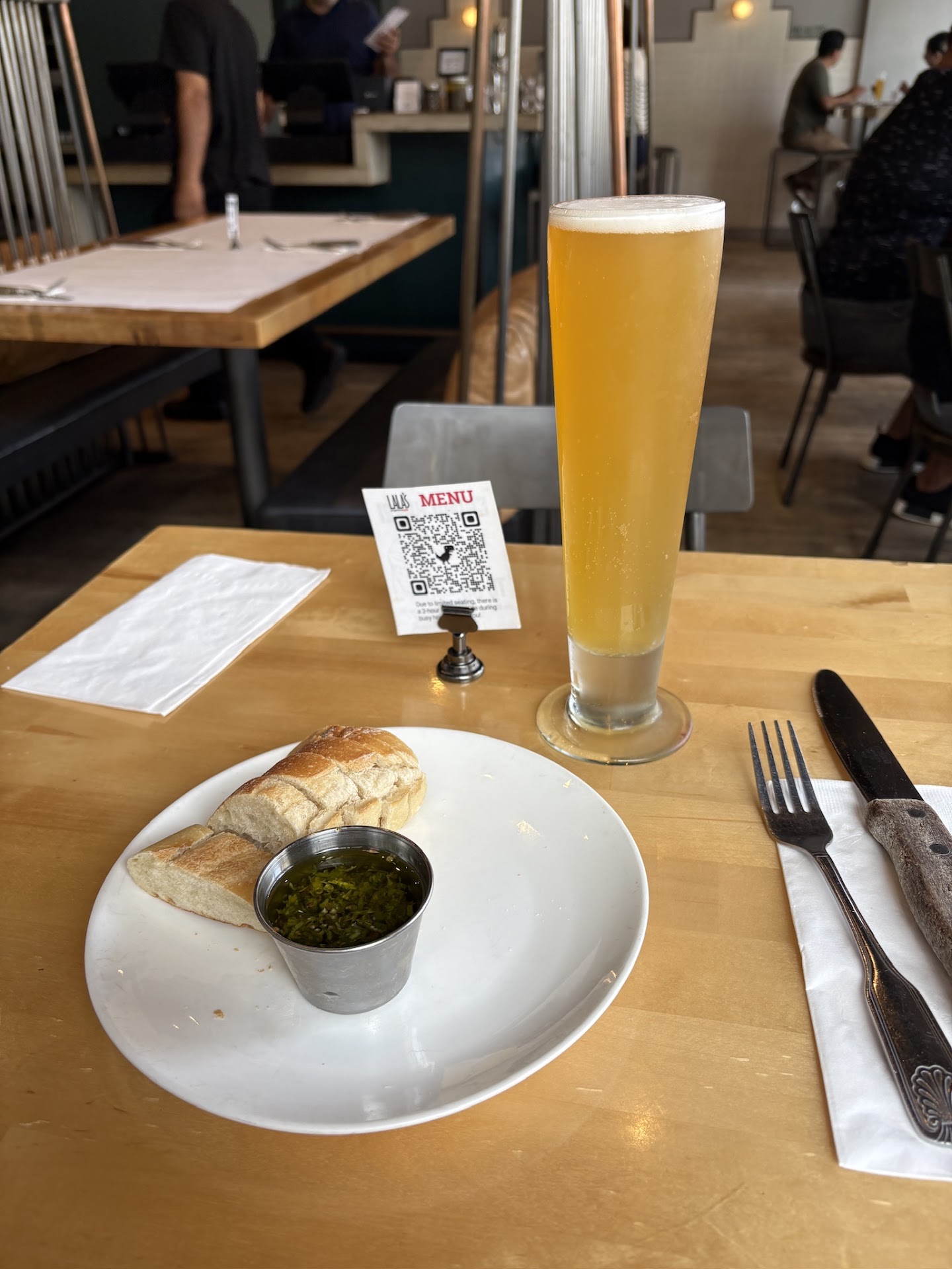 I visited the restaurant yesterday right at 4 PM. I ordered a ribeye steak cooked medium, along with a beer and chimichurri sauce. The bread that came out was plain and nothing special, though the beer was quite good.