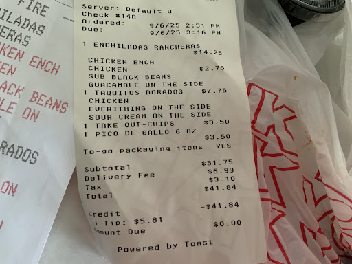 My family and I have been patrons of the reseda location on Vanowen ave. since it’s been around. The food was authentic affordable and delicious and a reasonable amount of food, no frills with a fun traditional Mexican art atmosphere. Of course there’s no expectations that prices will remain the same after the years but there was a basic formula that kept the menu affordable. When moved to the Chatsworth area we were excited to discover a new location. We’ve only ordered delivery from there 3 times. Food is consistently simple and delicious. The prices have significantly increased. To order 1 combo dish, 1 appetizer, an add on (one extra enchilada or taco), chips and pico de gallo. Each one a separate charge because there’s no pico or salsa or a handful of chips with any meal. $50 to have it delivered. Was able to make 2 meals out of the food but you know with delivery is always another $20 + to get to your house. So if I cost average a meal for two which is only one combo meal and an appetizer because we split its affordable at $13-$15 per person, but if we order 2 meals and an appetizer and chips and salsa it’s a lot of money from the original menu. It’s far from affordable. I know it’s the times but the departure from the affordability is a tough one to take in as it’s been a family staple for us. My major complaint though is each time I’ve ordered delivery from the chatsworth location I ordered 1 add on item to the combo meal and they have not once in 3 orders put it in the meal. I’ve now lost money on my last 3 orders. The last one was yesterday ordered enchiladas combo with an extra enchilada. Yet again no extra enchilada but have the chargers on my card and receipt. I don’t recommend ordering delivery from this restaurant. I don’t even call because the first time I called and let them know they argued with me. I just quit ordering delivery from this restaurant after being a lifetime patron. Authentic Mexican food is not hard to find in Los Angeles , 3 stars because it’s always yummy not phenomenal but yum. Oh and our family has been and continues to patron their other restaurants the family owns across the valley. So I’m kinda bummed from the delivery experience. If you choose to go great but don’t order delivery. Our family is always happy to support local family businesses. Attached receipt as can see add on item (the one item that never gets delivered) plus the cost of delivery and tip and if you want chips and some type of salsa those also need to be ordered as separate items. Can’t just get a small side...