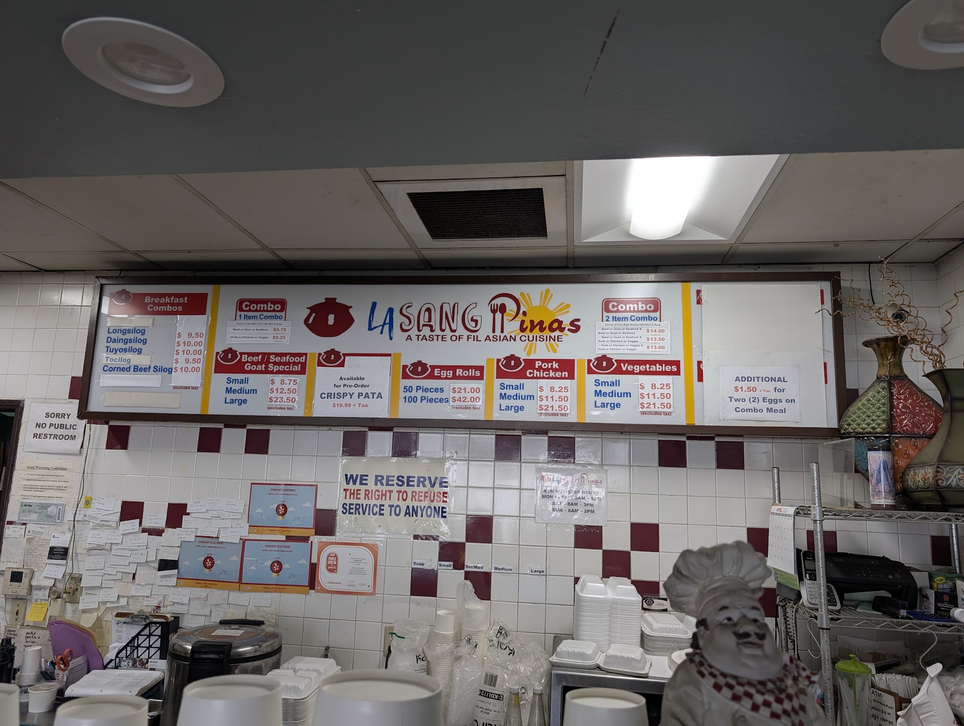 You take your pick of 1 to 3 native Filipino viands with a side of plain or garlic fried rice to create your lunch combo meal. The cooked rice is okay (personally, I prefer a better quality jasmine rice). Soup is free, so don't hesitate to ask for it on the side. Most dishes are on the meat category, but they usually have 1 or 2 vegetable dishes per day. It's also also noteworthy that they serve exotic Filipino dishes here like their unique, home-style bopis (pork heart and lung stew), my favorite dinakdakan (savory sour pork belly slices) and the gutsy papaitan (spicy sour and bitter bile soup), a dish you will either love or hate ๐.