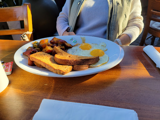 Wife and I went to this place when we were in Westwood recently. We wanted to go to the Lusk Center, but it was the day after the Superb...errr, the Big Game, and it was closed. The woman who answered the phone told us it was closed and recommended a couple of nearby places for breakfast. Kudos to her. We chose this one cause it was close. When we arrived, there were few patrons. The waiter said to pick any seat so we sat outside. The wife had the 'two eggs any style' early bird special and I went with my standard, French toast. We also had coffee. Coffee was good. We would have had more, but we had to go. The two eggs were quite good, claims the wife. Came with toast and roasted potatoes, a LOT of potatoes. The wife was VERY satisfied. Eggs came like she wanted, toast was good and potatoes were good. She would come here again. My French toast, 3 pcs., came with bananas and sliced strawberries. Now I am one who rarely eats fruit like this, when there is French toast that will soon be covered in Maple something soon.However, the banana and strawberries looked good so I thought I would try them. I am glad I did! Contrary to my nature, I ate ALL the fruit. It was good. Once the fruit was out of the way, I got down to business. Put some of the maple stuff on the toast and some butter. The first mouthful confirmed it. I WILL be coming back. The toast had some sort of spice in the mix that I could not quite identify but which really made it special.