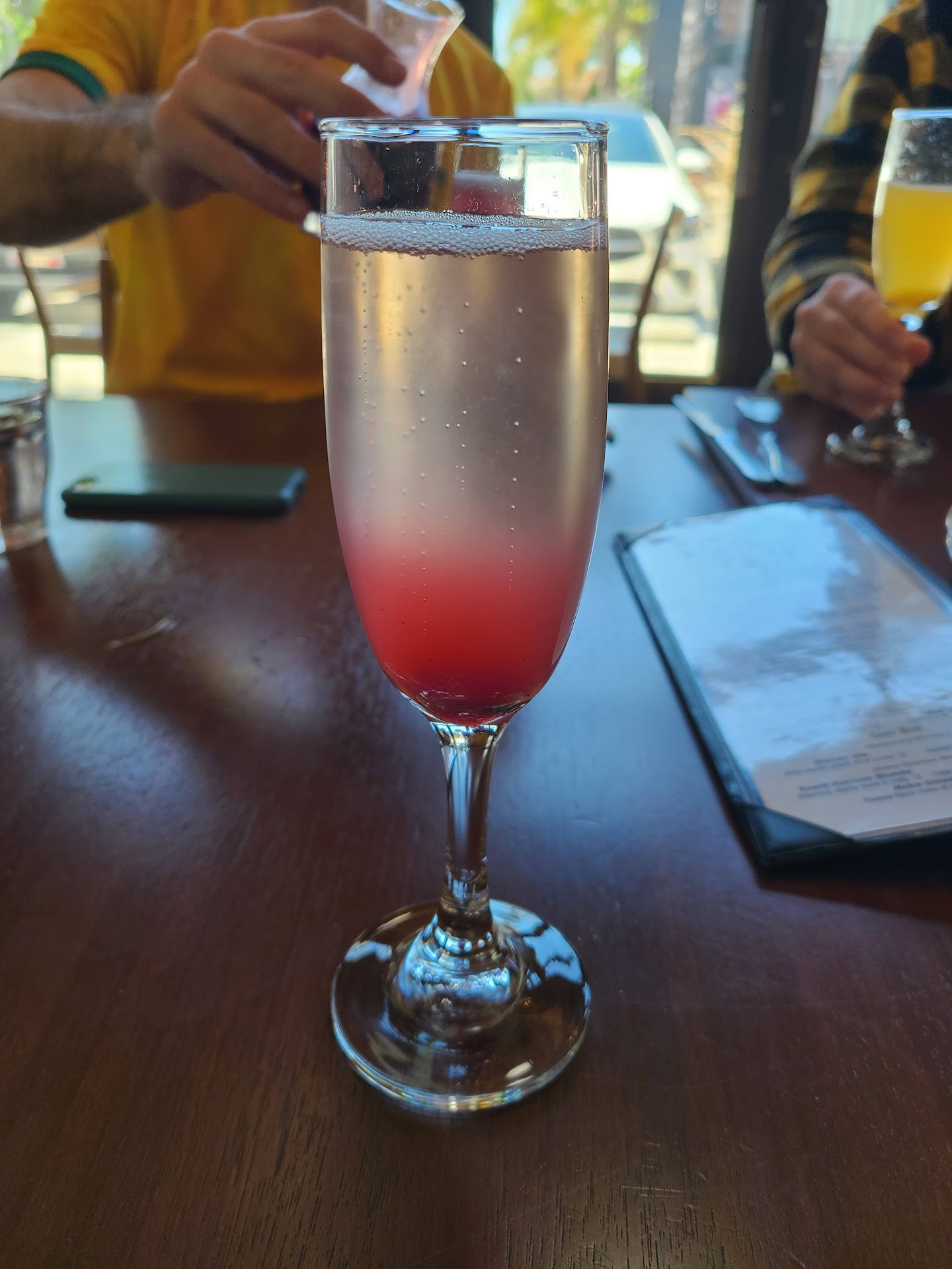 We sat inside and were one of a handful of tables in there; everyone else seemed to be out on the patio, which had pretty good shading. Everyone working there was so attentive and friendly. We ordered a bunch of food, with some modifications, and that was no problem. Everyone loved everything they got! For the starters, I tried the hummus and octopus. Both were SO good. The octopus was particularly well cooked; just crispy enough without being overdone and rubbery. The pita was so tasty we had to get an extra order. My friends had the zaatar, too, but I was too busy with the other two dishes to try. We also got the brunch special with a bottle of prosecco and choice of two juices, which was fun for brunch. Pictured is one with a (very light) portion of wildberry juice.