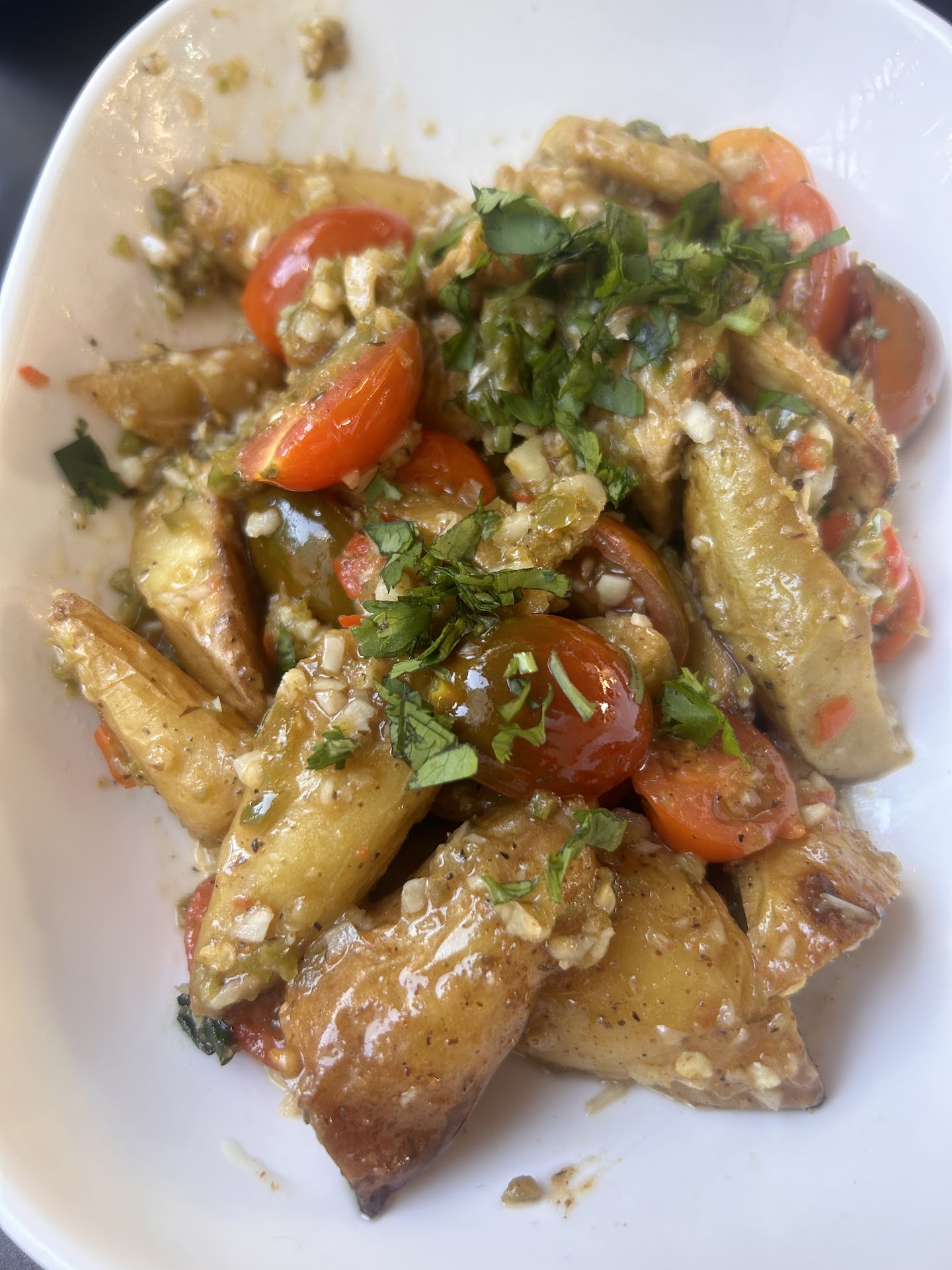 Food: The garlic herb bread was divine- I’d go back here just for this. The bread was surprisingly gluten free and had a yummy chewy texture mixed with fresh cheese and herbs inside. The platter - this was deliciousss and came with freshly made, gluten free pita bread and 3 different dips (each of which were sooo flavorful and balanced). Everything on the platter was so good, we couldn’t stop eating haha. Even the rice was well seasoned with a slight apple cinnamon flavoring. Could tell that the ingredients they used were very fresh- the server told us all the meats were organic & grass fed which was a nice plus :) Dessert - this was our first time trying Knafeh which is melted cheese encased in a crispy flour shell with pistachio & lavender. SO good, we were so full after this but our forks couldn’t stop going back for more. Drinks - they have a solid drinks selection of coffee, lattes, teas, wine, etc with happy hour from 3-7pm. I had one of their roses which was delicious and paired well with the food