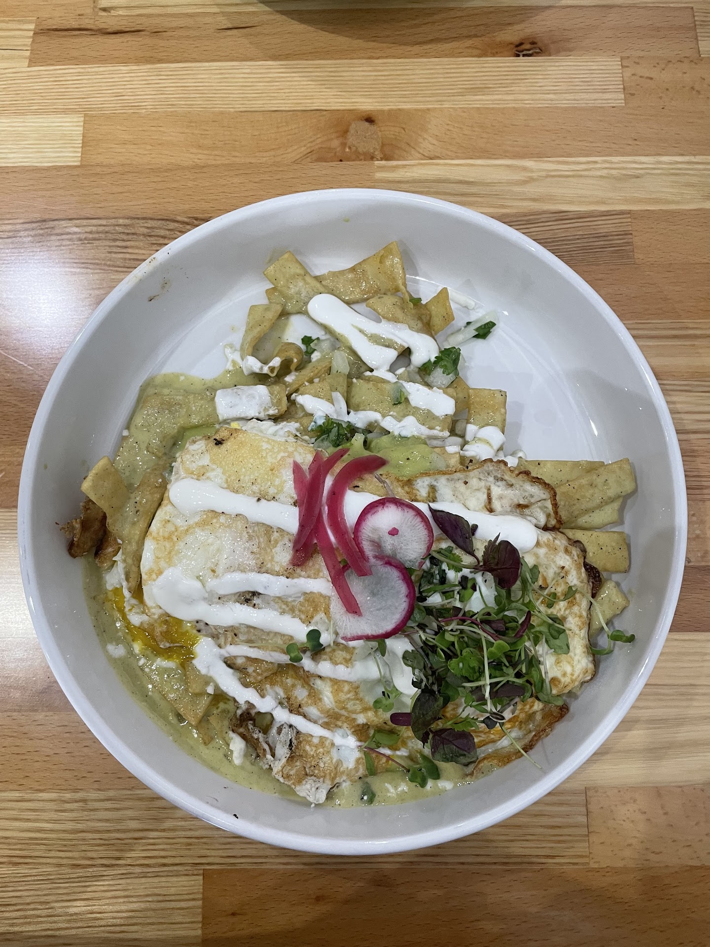 for food, i ordered the chilaquiles verdes, which was delicious, 10/10. my eggs were perfectly cooked and the salsa was so tasty! my partner ordered the mole chilaquiles and he seemed to really enjoy his food. it’s rare that he gets full from one entree but to our surprise he was completely out by the time he finished. these dishes were super filling, which i wasn’t expecting.