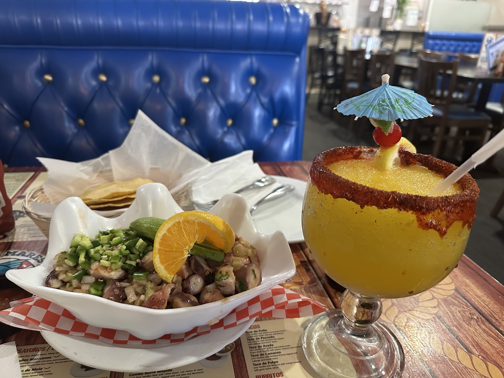 Read moreThe best thing about this place was the food presentation, all of the food was plated with care and very lovely. I came in for an early dinner and I was the only customer but they had the music blasting so loud I left with a headache. The chips and salsa were excellent, and my food was ok. The octopus had a few bad spots in it that were not fresh. I had the octopus ceviche so it's easy to hide old octopus when it's chopped up with a lot of delicious ingredients. but sadly, some of the pieces were just chunky and beyond slimy, which should never Be served. As for the mango margarita, my waitress made it and it tasted like Kool-Aid. It was very pretty though, so it showed that she took care to make it. Someone needs a teacher how to make a margarita...