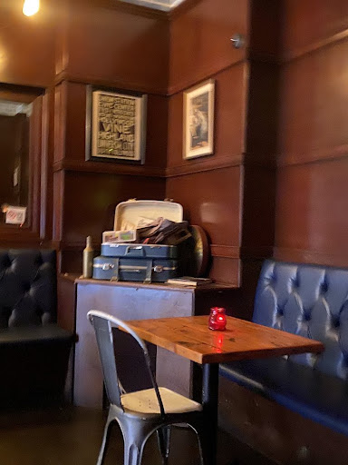 Decorative wood covered the walls and furniture scattered around the cozy establishment. Random vintage clothing are hung around the bar to give the feel of missing items.