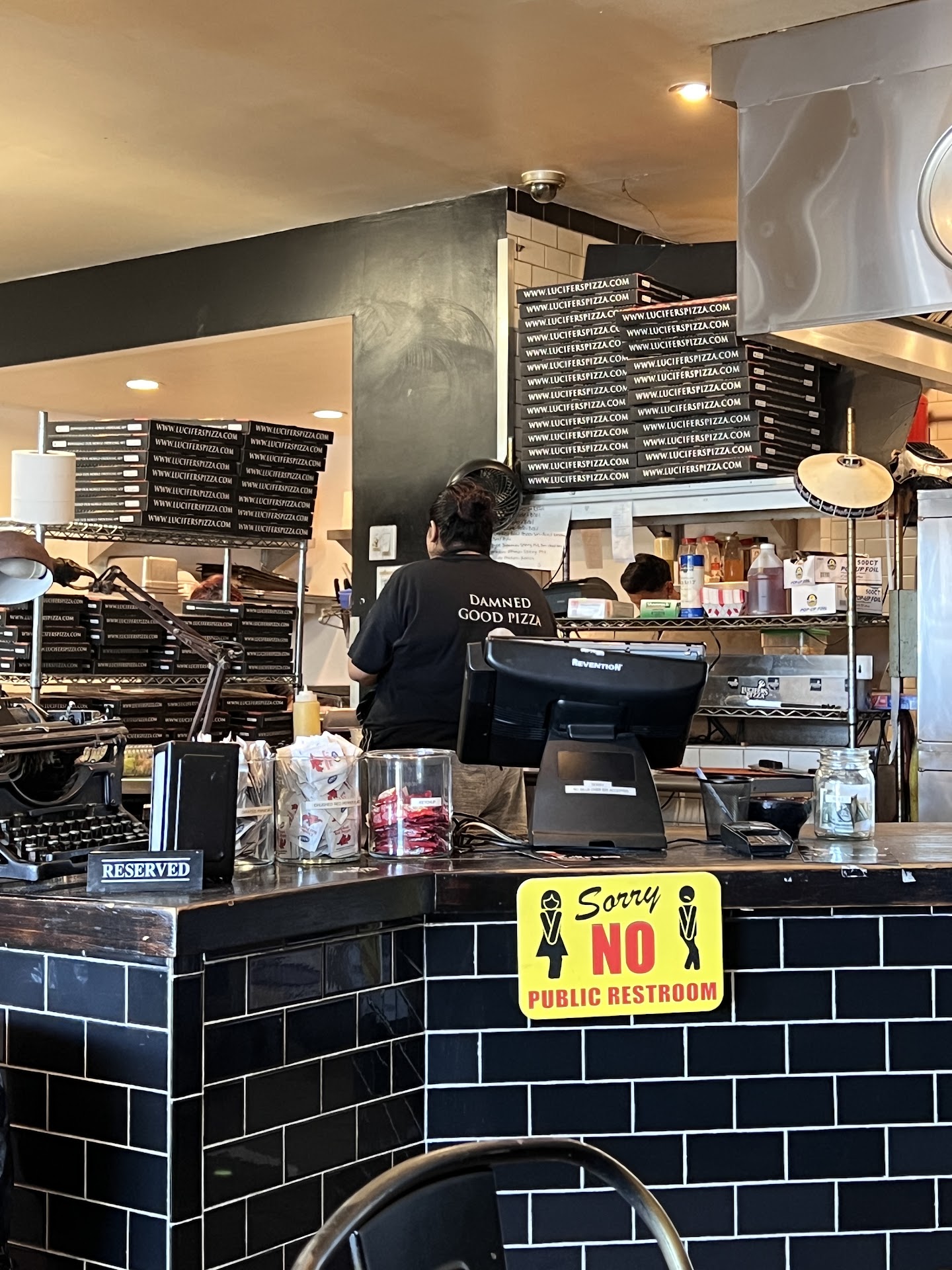 We eventually ordered a few minutes later and sat down. Before our food came I asked if there was a restroom (thinking the sign was for people who weren't customers.) I was told there was no restroom for customers, only employees and that I could go "ask around" to see if another business had one. So I asked if there was a place I could wash my hands - this is pizza place after all.. I was given the rudest response by the woman in the photo. I asked if she could please give us a few wet paper towels and she then let out a sigh and turned her back on us. My friend went back up to her and asked again when she replied "You're going to have to wait a few minutes, I'm busy" then again turned away and proceeded to browse on her cellphone. After a third attempt the gentleman who was working was nice enough to give us wet and dry napkins.