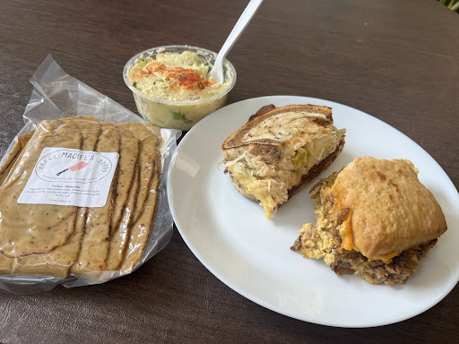 I spent a lot of money on food and desserts here and had a bad experience for my first time, but I know many people still love the food. I ordered a very delicious churro pound cake and a steak sandwich that came doused in potent horseradish aioli. Before ordering, I inquired about the sauce to see the horseradish would be very noticeable and I wasn't advised by the woman taking orders on whether to get it or a different option – only on different sauces (no regular aioli). It took about 15 minutes to get my order made because they have a constant flow of online orders that they seem to prioritize over people waiting in person. Online orders can take 6-15 minutes to get. I got my order for take out and left, but when I finally got to eat the sandwich, it was completely inedible for me because the horseradish took over the whole sandwich. I wasn't able to reach anyone by phone because they only take online orders, so I ordered 1/2 minestrone soup and 1/2 philly and drove out of my way back there to ask politely for a refund and grab another to-go order because I couldn't eat the $22 sandwich. Then I had a big issue with the woman at the counter. She's an extremely fake polite person who clearly does not care about the individual customer, and she ended up being very passive aggressive and started snapping at me after defaulting to rejecting my refund request. I politely pushed further and she ended up talking to her boss and he approved it, but it took 20+ minutes for this whole ordeal that she was angry at me for because she was overwhelmed with the orders coming in, but I was being genuinely polite and patient the whole time despite my grandma waiting in the car (I told her this and she couldn't care less and snapped at me) and me having to stand around for all that time when I have injured feet. Additionally, the philly came with jalapeños which tainted the sandwich but I must have forgotten to click "remove" online after having a lot of difficulty with their online system and having to retry ordering multiple times through different platforms. The meat itself is good (the vegan steak was yummy) and I enjoyed the hearty minestrone but the sandwiches themselves were mediocre and small.