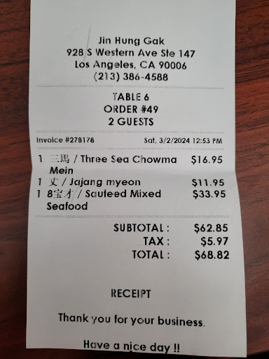 I would not reorder Jajang myeon if we go back. Their ๊ฐ์ง์ฅ has been always good, but not Jajang myeon...It is okay...but not that good. ํ๋ณด์ฑ- We both loved it. (However, we asked for mustard sauce, but it was not a spicy mustard, but rather taste like a regular mustard sauce you would eat with burger or chicken nuggets). ์ผ์ ์งฌ๋ฝ - I can give 1 out of 5 stars...The soup base does not even taste like any seafood flavor, but full of hot pepper oils....making the soup extra greasy.
